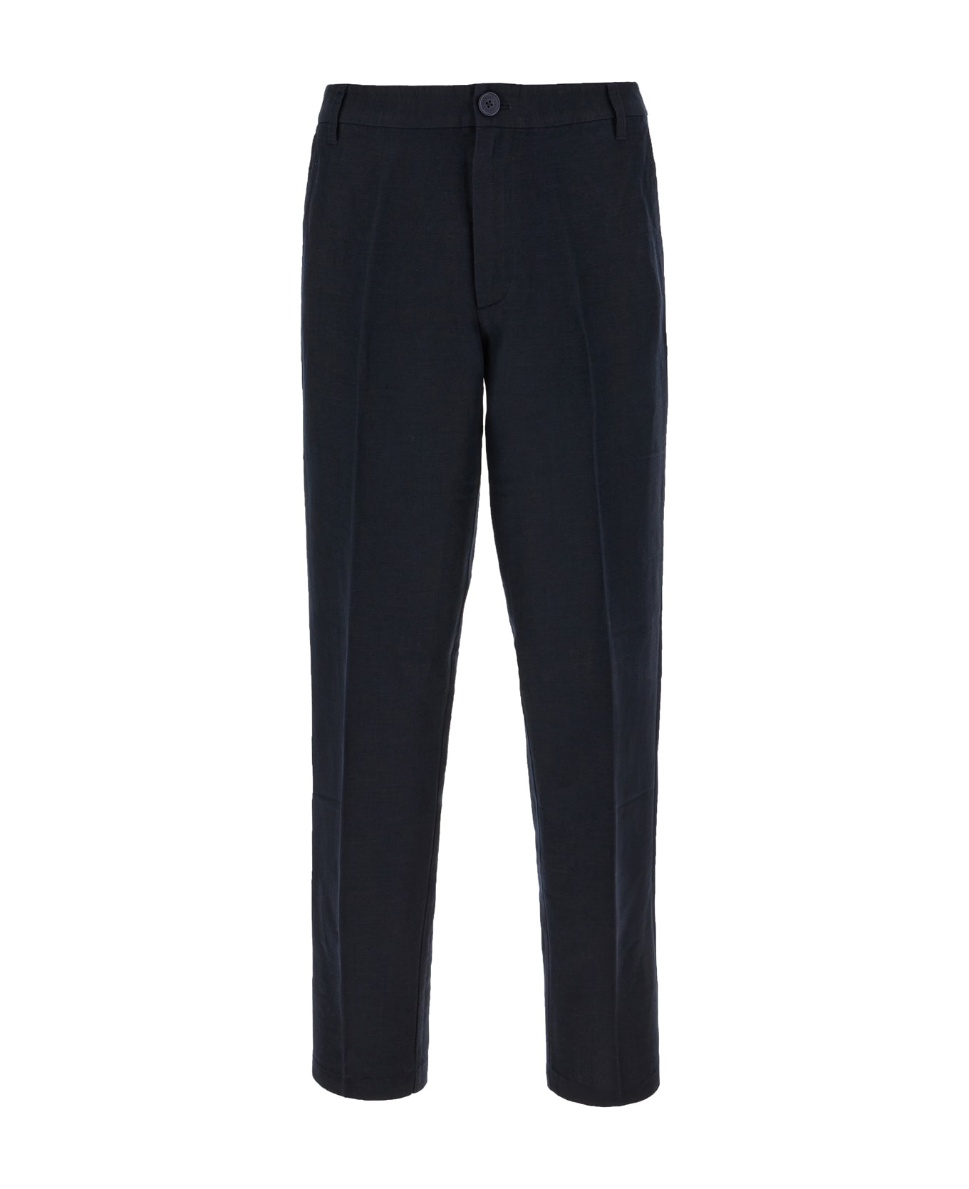 Pants realized in linen blend enriched by metal logoed plate at the back. -Belt loops at the waist -Concealed zip with a single visible button closure -Slant pockets and two slit pockets at the back -Central ironed pleat