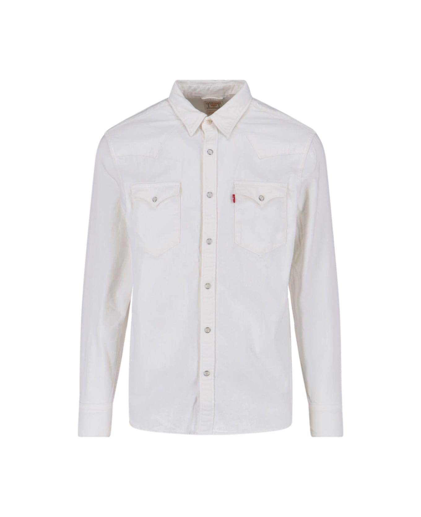 White cotton denim Levi's Strauss Barstow Western Standard shirt with collar, button closure, long sleeves, two front button pockets, logo label on the front, button cuffs, curved hem.
