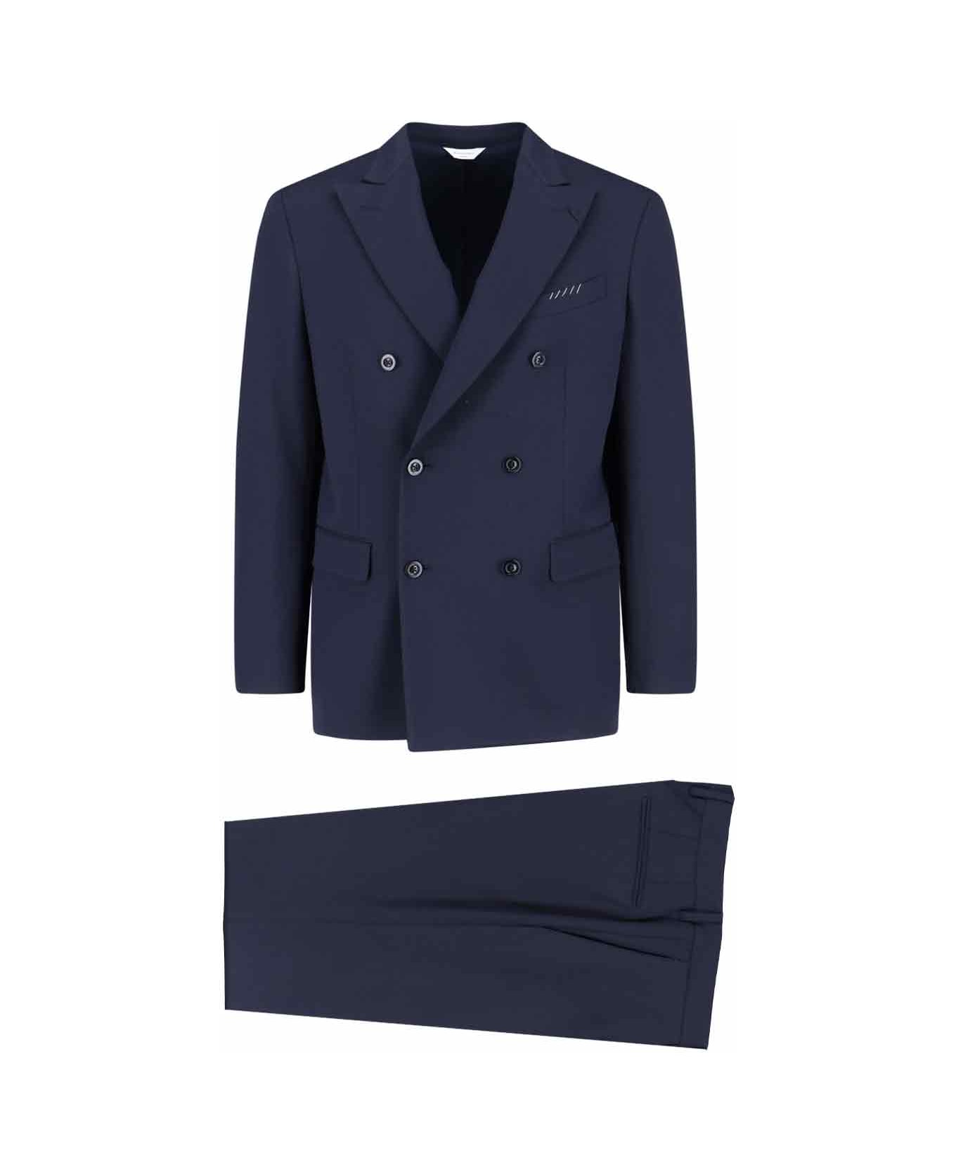 Boglioli double-breasted suit in virgin wool blend in navy blue fabric with peak lapels, button closure, chest pocket, two side pockets, buttons on the cuffs, straight hem, straight trousers, mid waist, belt loops, button and zip closure, front pin tucks, two side pockets, two back button welt pockets, straight leg.