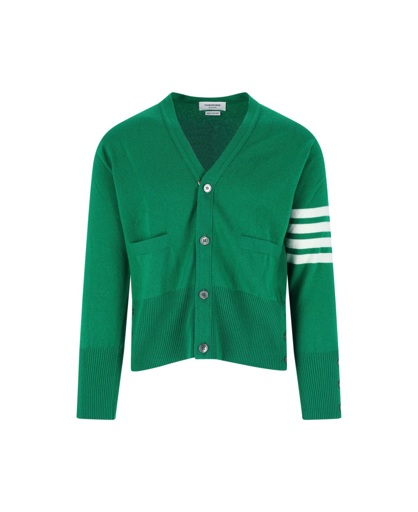 Thom Browne '4 Bar' green cashmere cardigan with V-neck, button closure, long sleeves, two front pockets, 4 Bar detail on the sleeve, ribbed trims, straight hem. Composition: 100% Cashmere