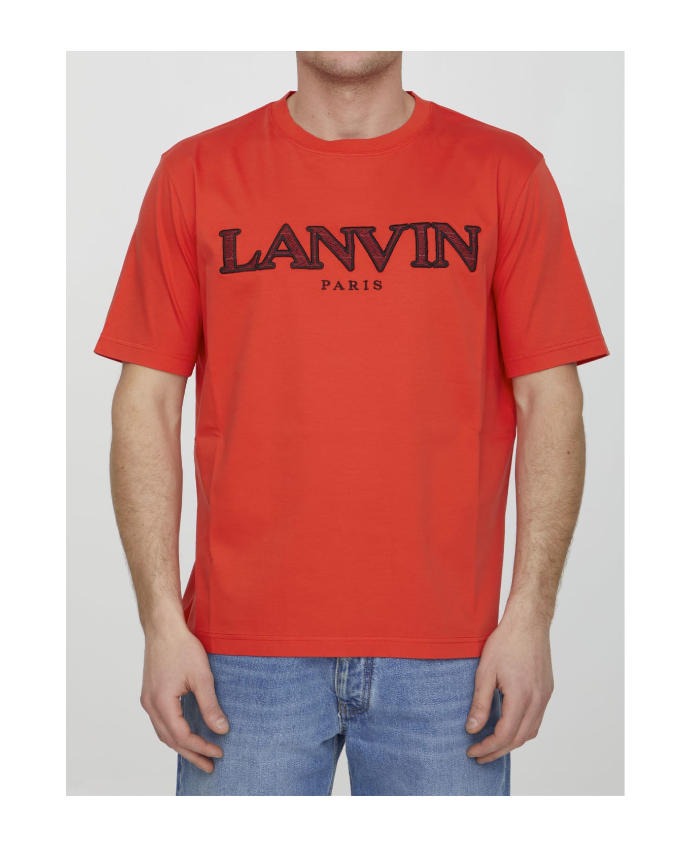 Short-sleeved crewneck t-shirt in red cotton with tone-on-tone Lanvin Paris logo embroidered on the front. Ribbed neck. Regular fit. The model is 184cm tall and wears size L.