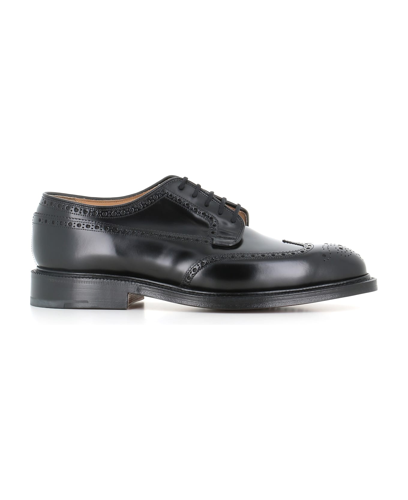 Black men's brushed leather derby Shoes by Church's, featuring by an almond toe, lace-up front and decorative perforations. Lined interior. Triple leather sole. Goodyear construction. Heel: 3 cm Composition: Leather