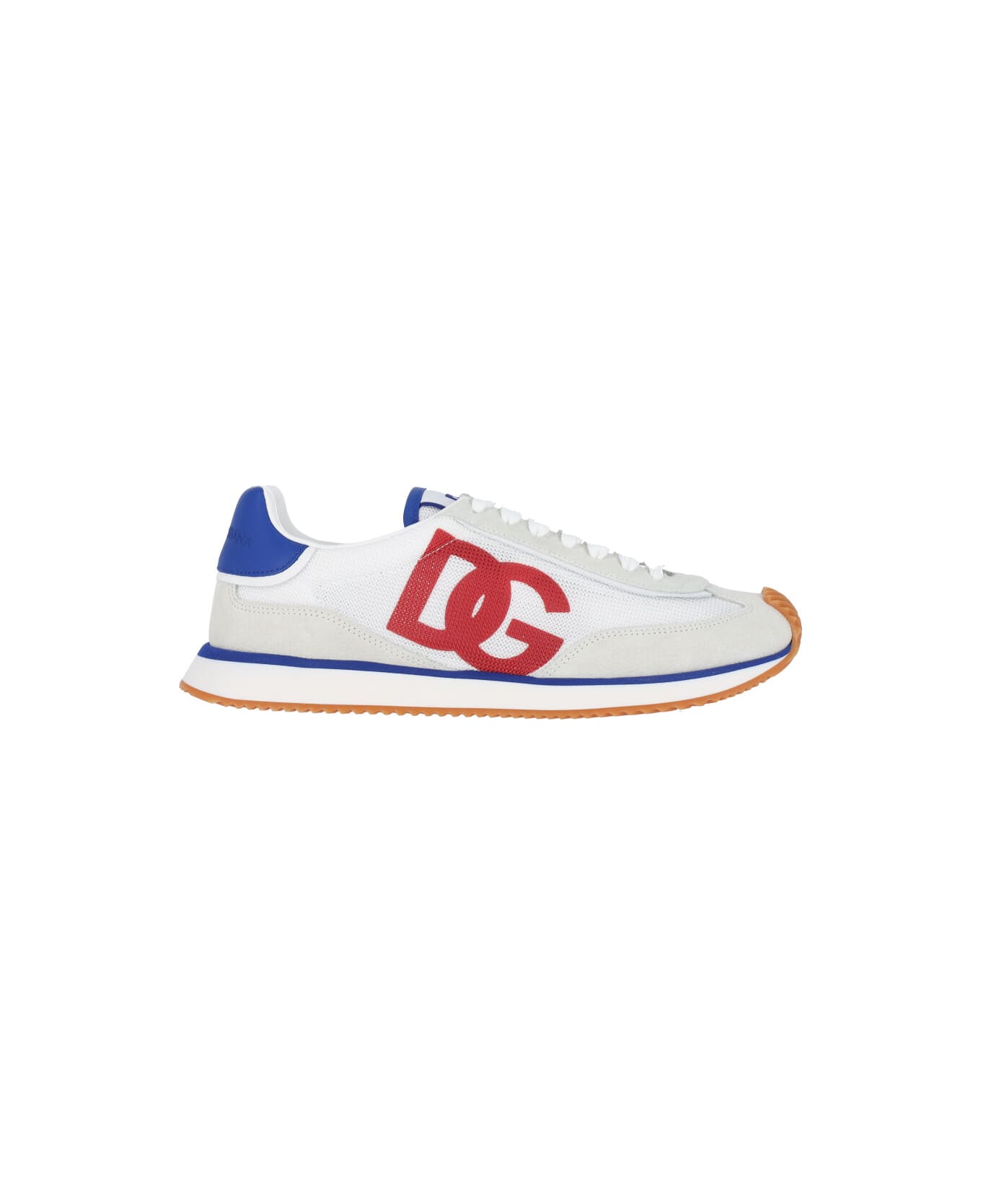 Dolce & Gabbana DG Cushion sneakers in white suede calf leather with round toe, laces, logo label on the tongue, side mesh inserts, red logo print detail, blue leather back tab, embossed logo detail, rubber sole. Composition: 70% Calf Leather, 30% Polyester