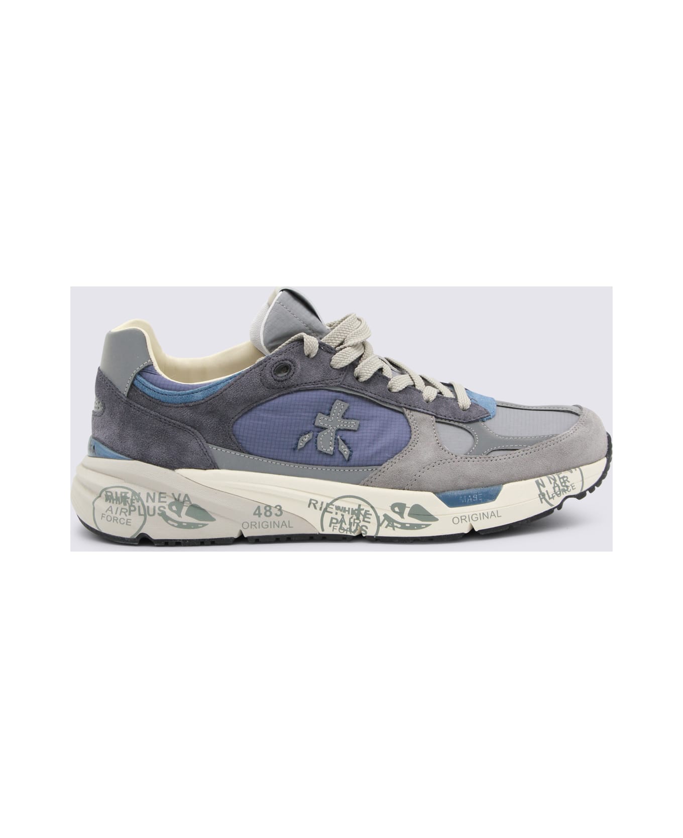 Blue and grey sneakers from Premiata featuring round toe, laces fastening, rubber sole and details.