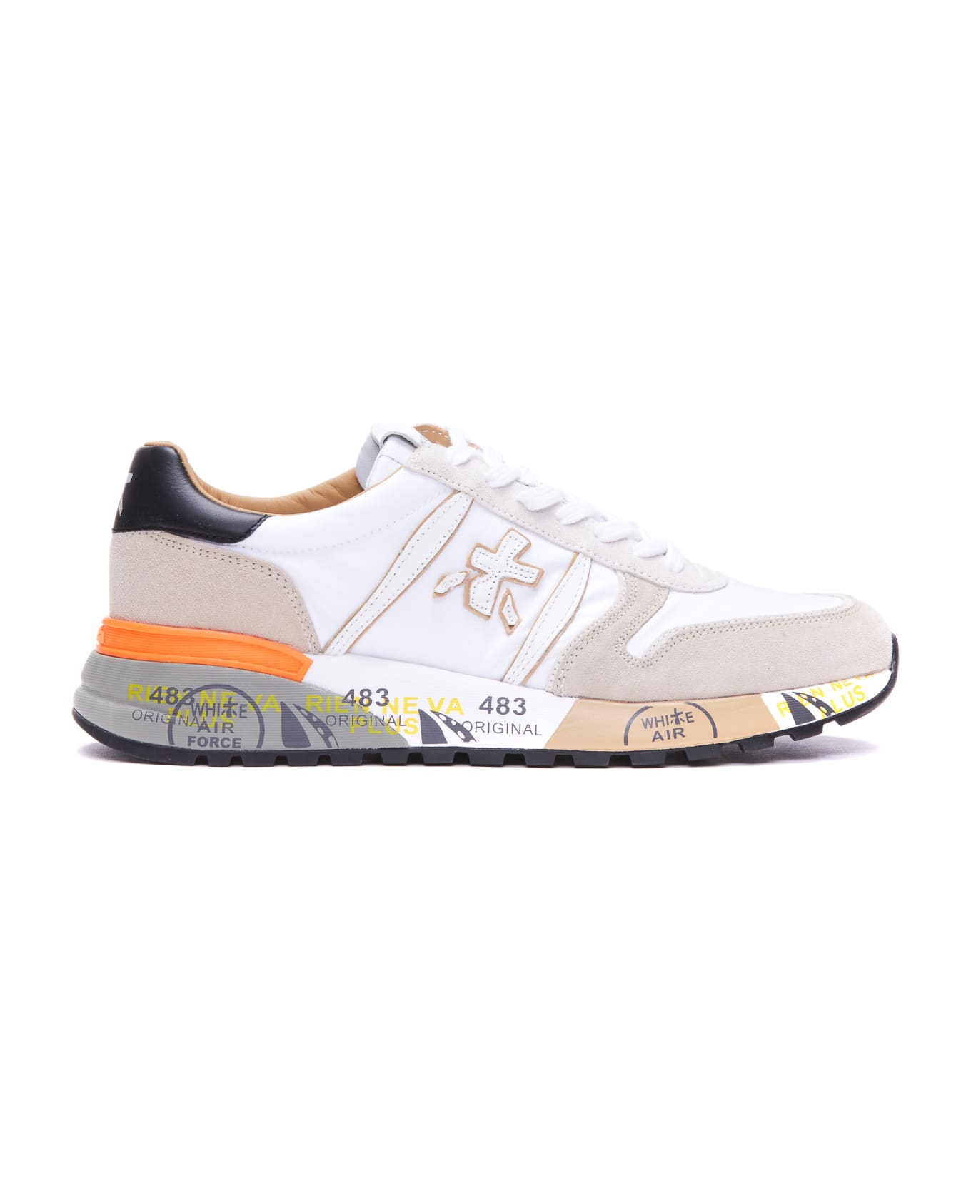 Premiata white Lander sneakers, leather and fabric upper, laces closure, logo, round toe Composition: 50% Calf Leather , 50% Fabric / Rubber Sole Composition: 65% Eva, 5% Tpu, 30% Rubber