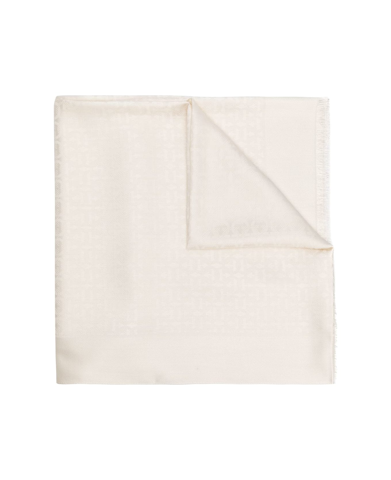 Logos. Logos everywhere. Made from an ivory silk-wool blend, this jacquard Gancini shawl from Salvatore Ferragamo will be closely worn around your neck. Never take it off. Featuring fringed edges and a large square shape.