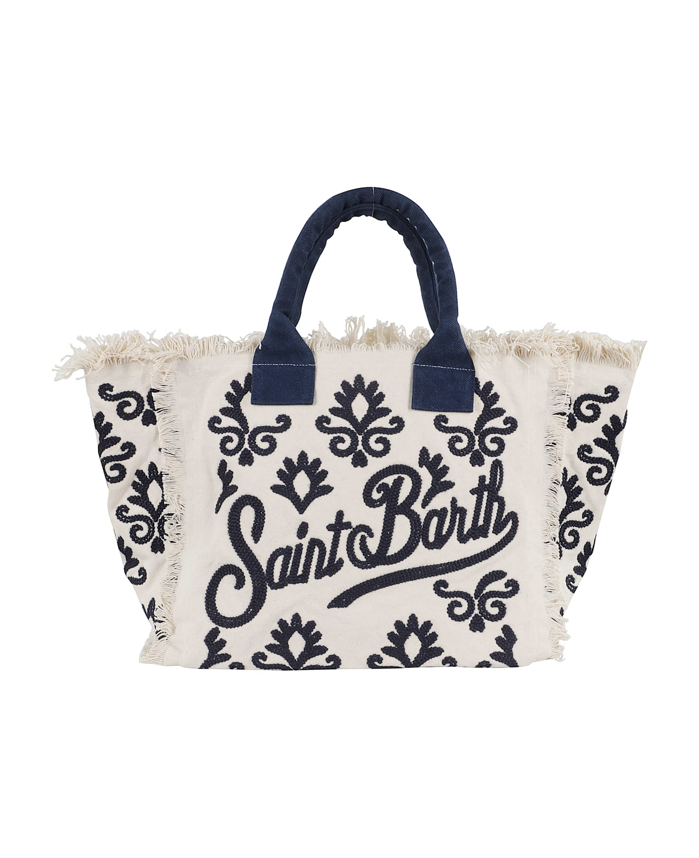 Vanity Rug Bag - MC2 Saint Barth - Ecru color - Made of cotton canvas - All-over blue embroidery - Double handles - Inside zipper closure - Frayed profiles - Size: 33 x 40 x 22 cm.