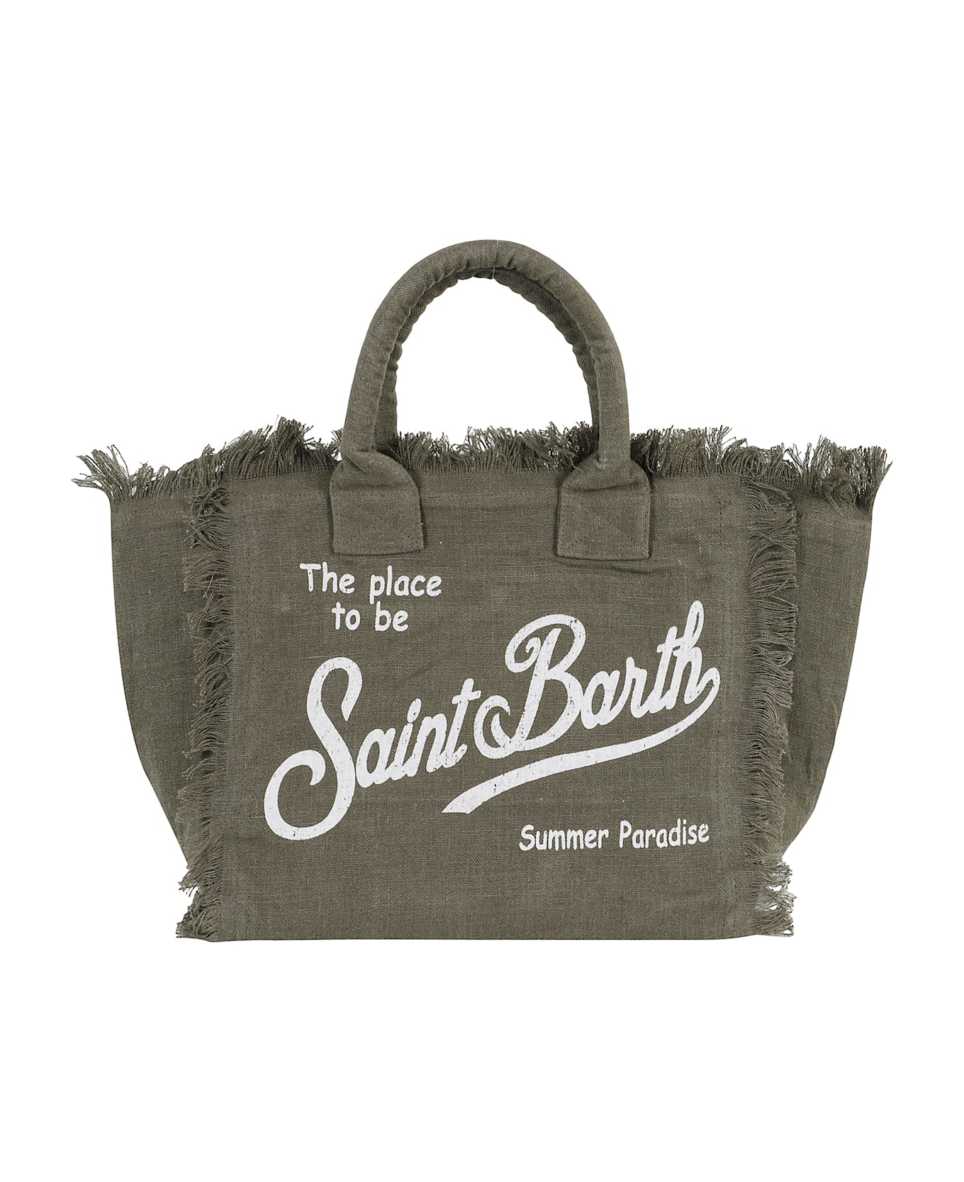 Vanity Linen bag - MC2 Saint Barth - Military color - Made of linen - Printed front/back logo - Double top handle - Frayed edges - Inside zipper closure - Size: 40 x 32 x 20 cm.