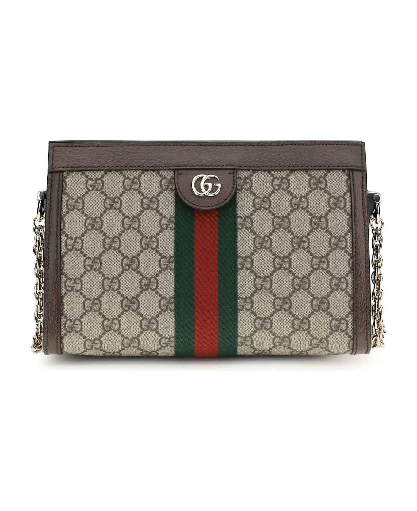 The ophidia shoulder bag by gucci, crafted from coated fabric with a beige and dark brown gg monogram and brown leather trim, combines elegance and functionality. enriched with light gold-tone hardware, double g detailing, and a web motif, it features a green cotton lining with two compartments and an open pocket. the chain shoulder strap and hidden magnetic closure complete the design, making the bag versatile and refined.
