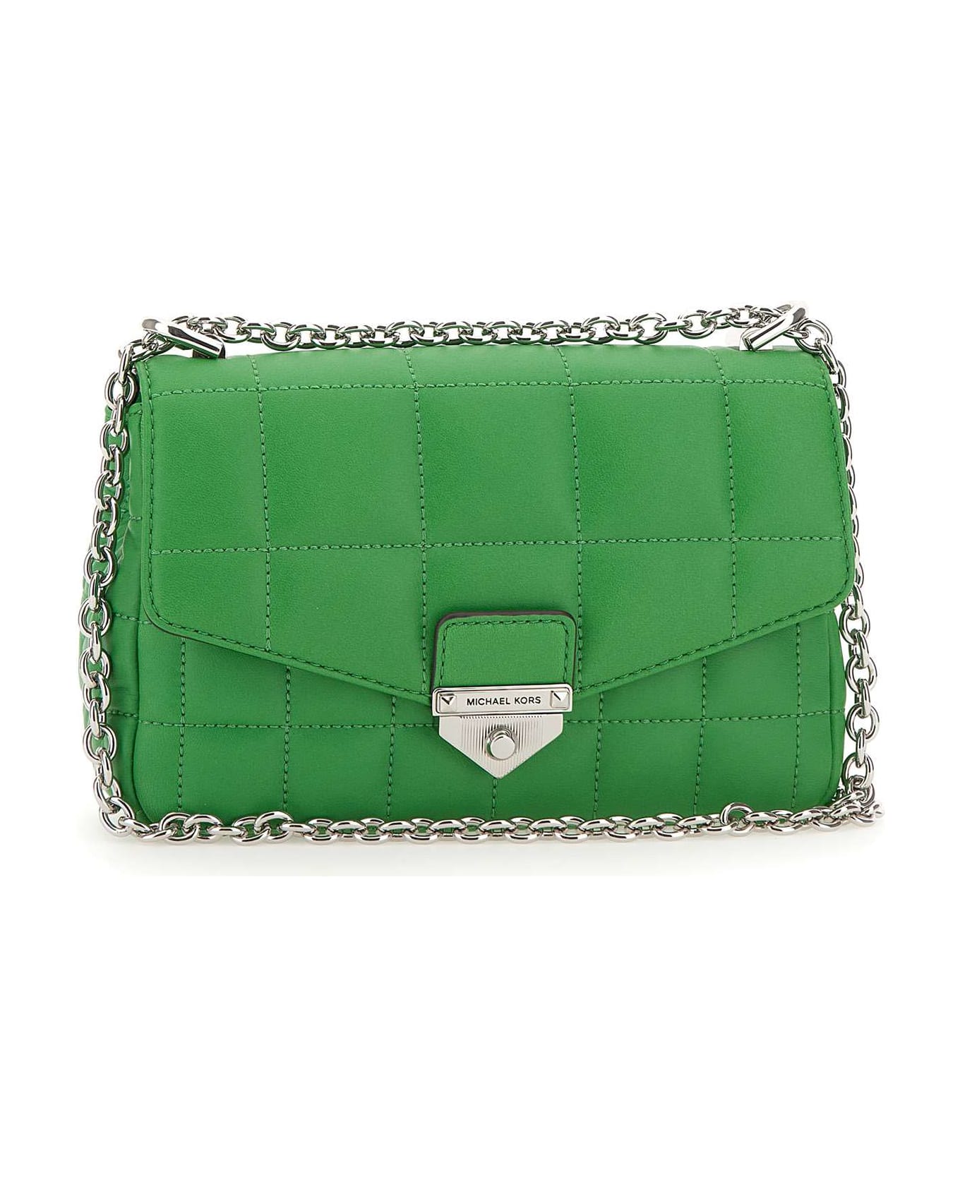 Micheal Micheal Kors "Soho" matelassé leather shoulder bag, green, closure with flap and logoed snap button, metal shoulder strap with leather detail 90cm, internal compartment with zip, internal pocket with zip, external pocket, silver hardware. Dimensions: height 13cm, length 20cm, depth 6cm.