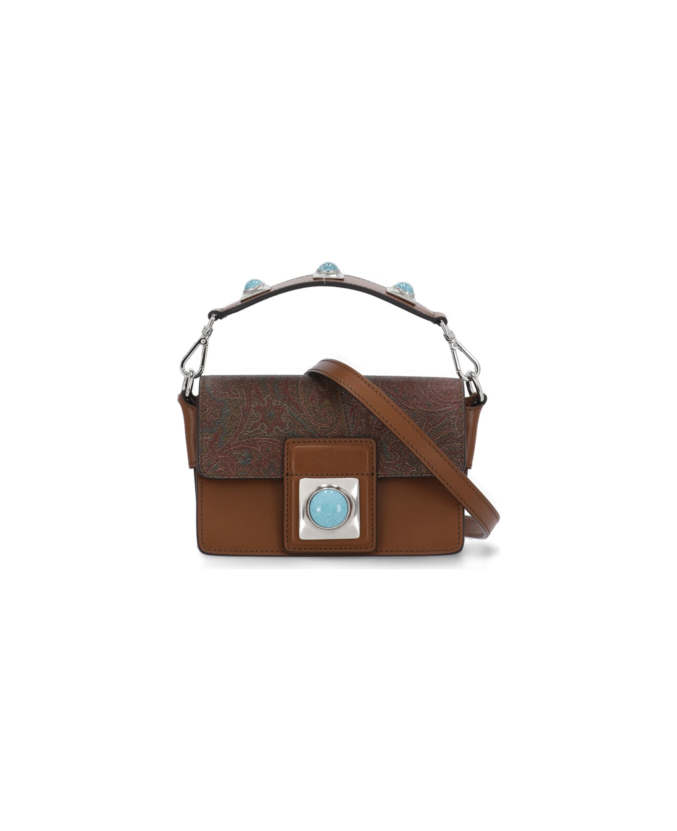 Crown Me Shoulder Bag from Etro: - Brown Etro fabric and leather woman's shoulder bag - One adjustable handle with turquoise stones - One adjustable and removable shoulder strap - One rear open pocket - Flap with Paisley pattern - Front fastening with magnetic button and turquoise stone detail - Three interior compartment
