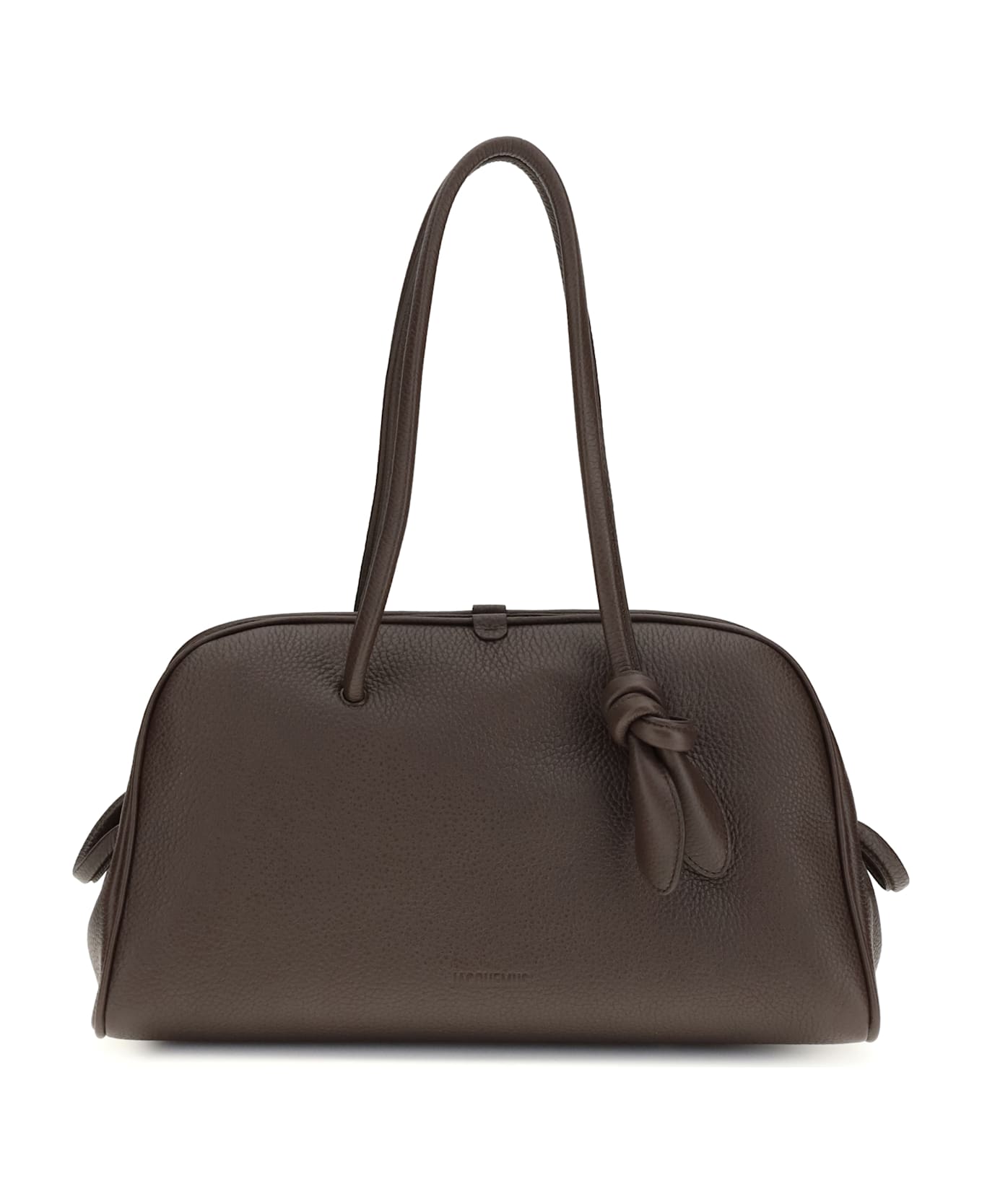 Il turismo shoulder bag by jacquemus is an elegant reinterpretation of the classic bowling bag, crafted from grainy leather. featuring a two-way zipper closure, it features a large patch pocket on the front, an interior zippered pocket and a refined bow detail that adds a feminine and distinctive touch to the design.
