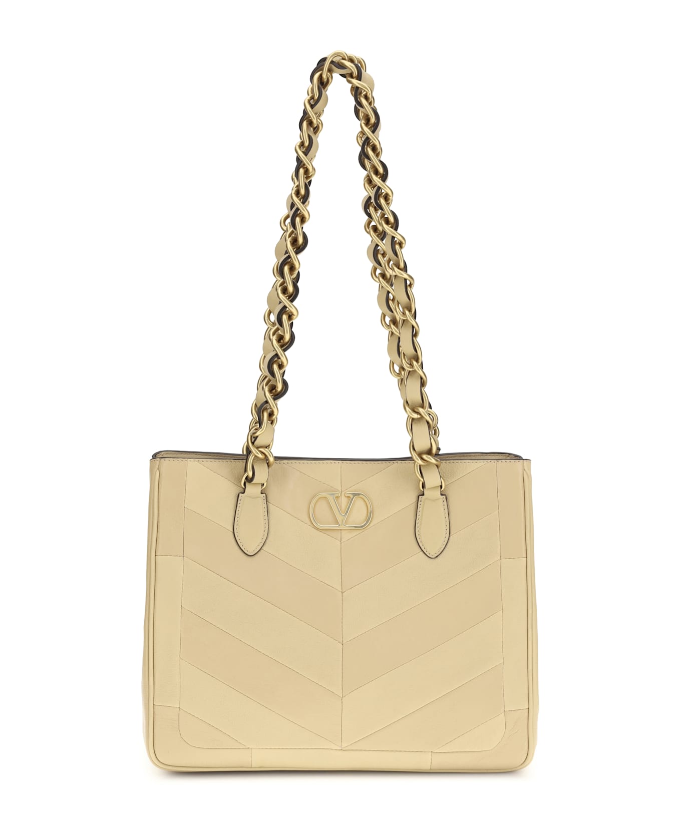 The laseine small shopping bag by valentino garavani is crafted from soft nappa leather featuring a refined chevron pattern created through a patchwork of matte and shiny finishes. the design includes chain handles interwoven with leather, allowing it to be comfortably carried on the shoulder. antique gold finish hardware enriches the silhouette, highlighted by the iconic vlogo signature metal detail. a magnetic closure ensures practicality and security, while the nappa-lined interior offers optimal organisation with both a slip pocket and a zip pocket. an elegant and sophisticated piece designed to elevate any occasion with timeless style.