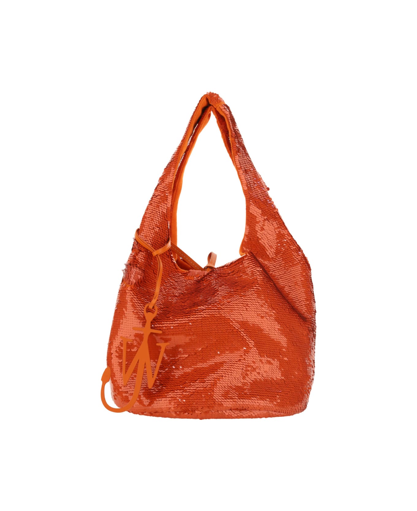Mini sequin bag by j. w. anderson, all-over sequin appliqué design, double wrap-around shoulder strap, interior leather drawstring closure, pendant hanging from the shoulder strap with the brand's iconic triangular monogram.