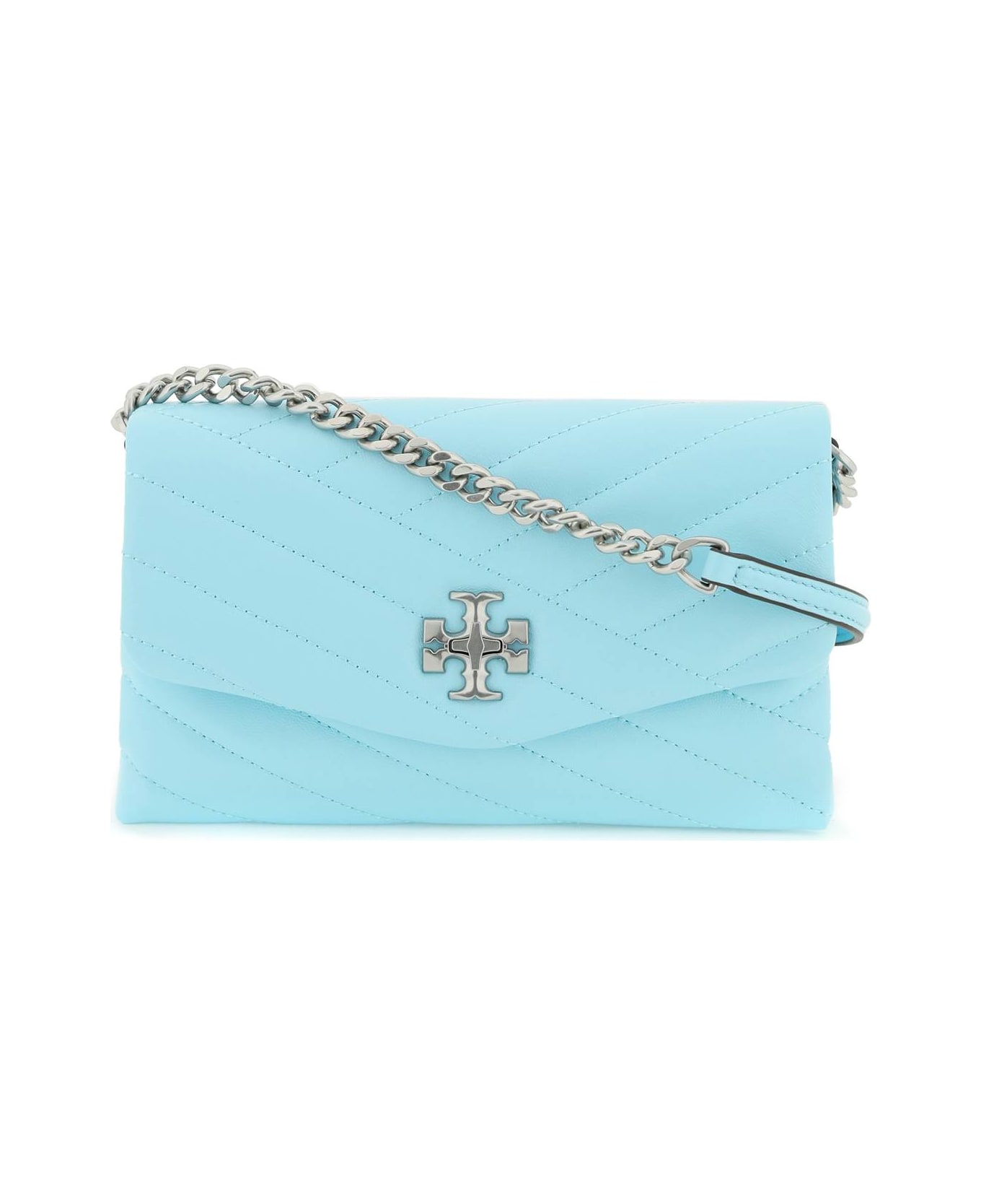 Kira mini bag by Tory Burch crafted in chevron matelassé nappa leather with leather strap featuring side chain inserts. Twist-lock closure with iconic double T. Fabric-lined interior with two compartments, middle zipped pocket, flat patch pocket and six credit card slots. One patch pocket on the back. Silver- finished metalware.