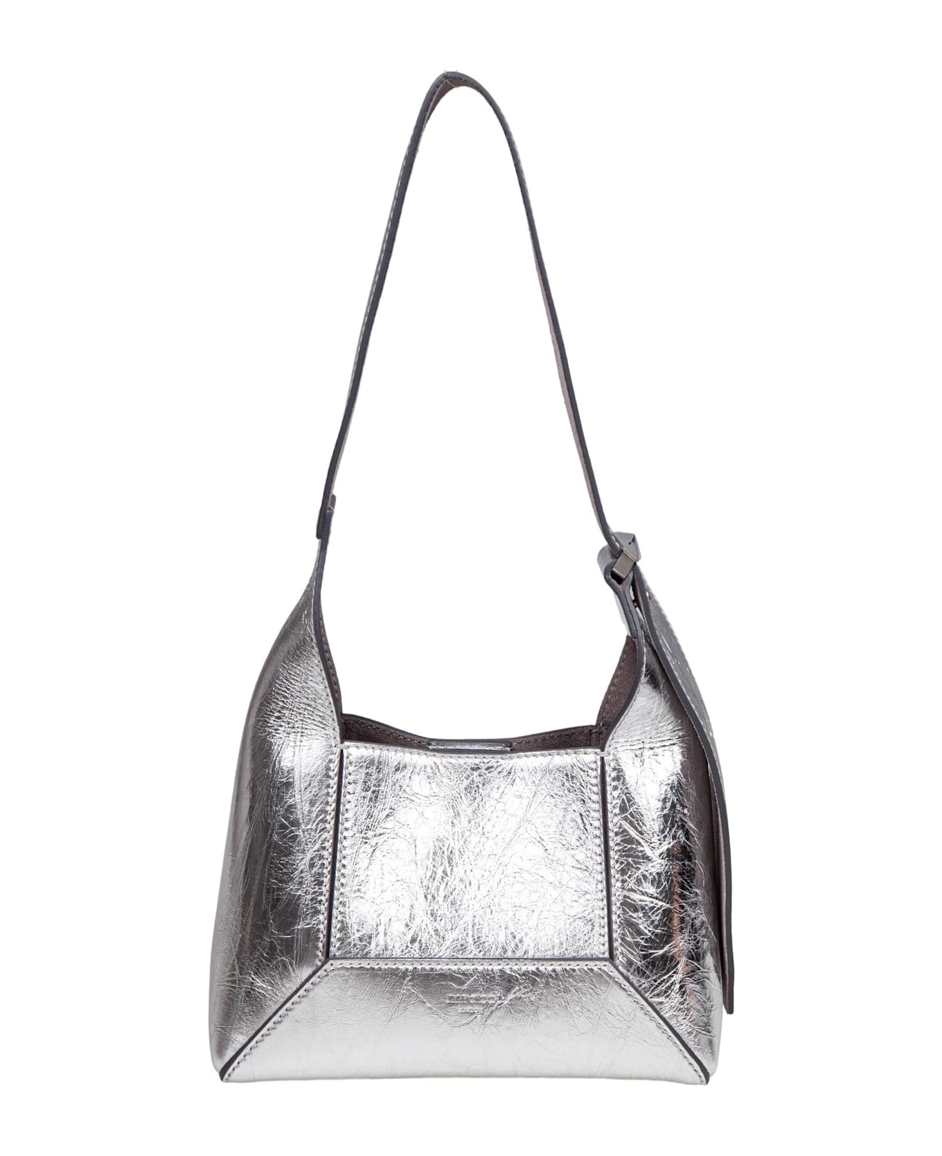 Laminated leather bag finished with stitched panels