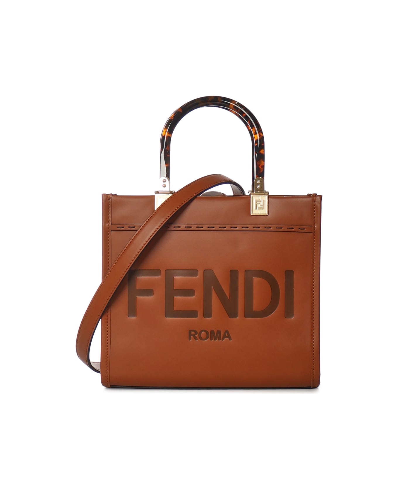 -Calfskin upper -Plexiglass top handles -Adjustable and removable shoulder strap -Lettering logo -Dimensions: 22. 5 x 25. 5 x 12 cm -Made in Italy -Color: Brown