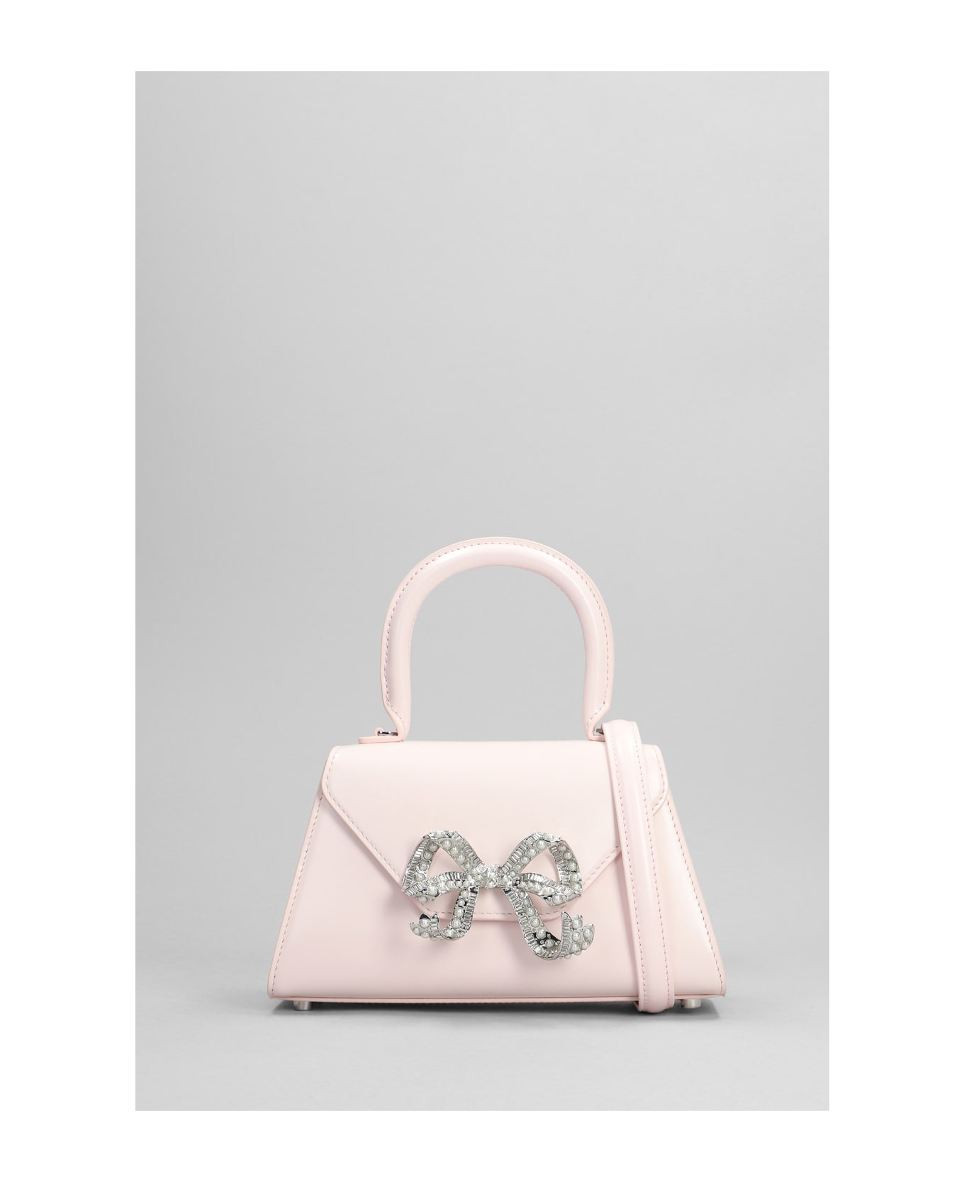 Hand bag in rose-pink polyester, hard top handle, crystals detail, metal feet at base, Made in China, Height 125 mm, Width 210 mm