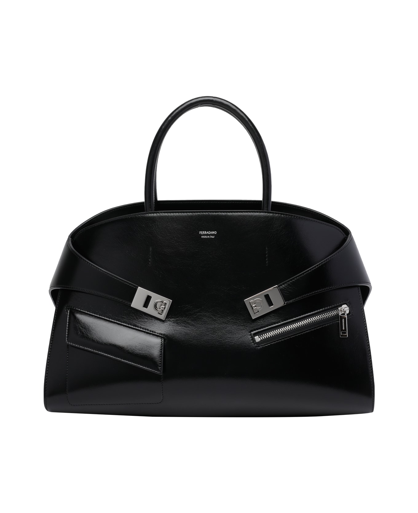 Ferragamo black Hug handbag, lace closure, inner zip pocket, external zip pocket and one clip pocket, 2 handles, adjustable and removable shoulder strap, logo Composition: 100% Calf Leather