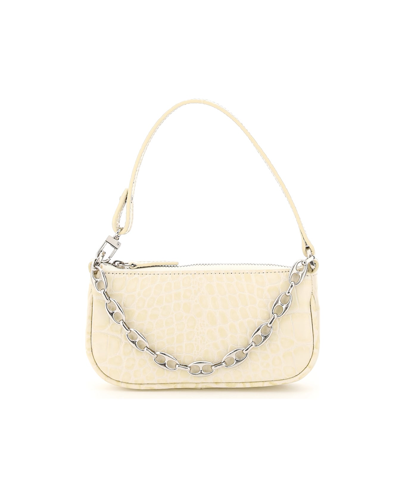 By Far Mini Rachel mini bag in crocodile print leather enriched with a decorative chain on the front. Zip closure, single handle with a snap hook on one side, fabric lining, silver-tone metal parts.