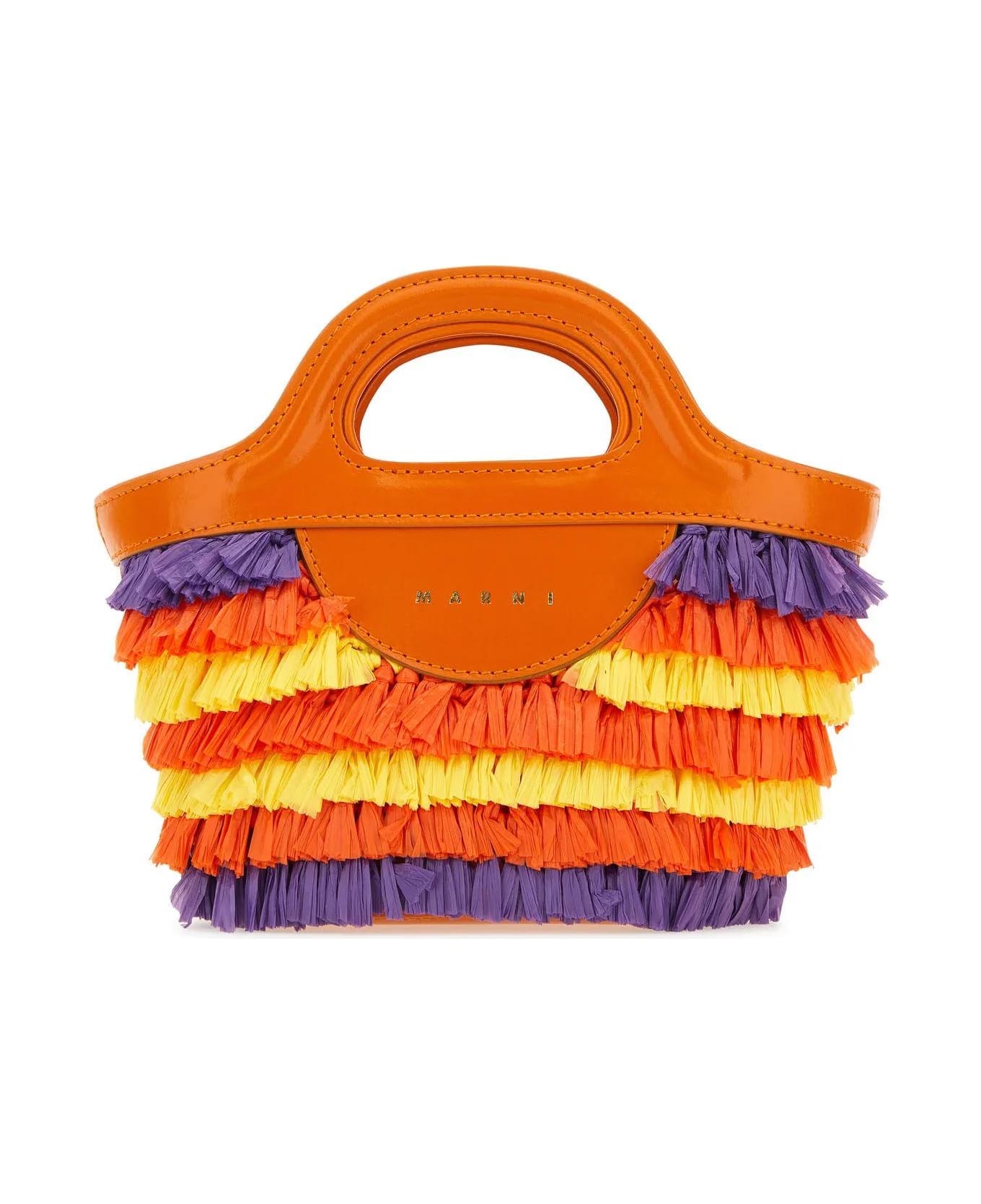 Fringed handbag realized in fabric with smooth leather inserts characterized by print logo at the front. - Two flat leather handles - Adjustable detachable leather shoulder strap - Strap closure - Unlined interior with a patch pocket Composition: Exterior: 100% Fabric 100% Leather Finishing: Golden metal