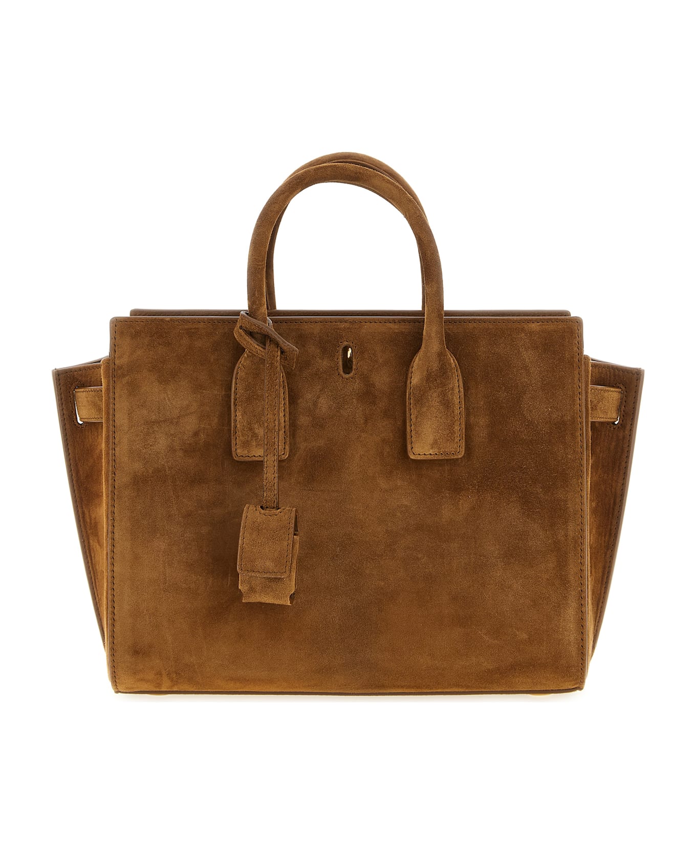 Small 'Sac De Jour' suede handbag with East-West design, extendable side gussets with adjustable inner straps, double fixed tubular handle, rigid base with metal feet, removable metal 'Cassandre' padlock detail, adjustable and removable leather shoulder strap, adjustable and removable tape shoulder strap.
