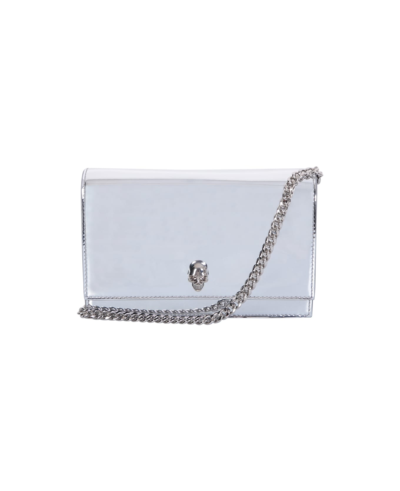 Skull charm. Foldover top with magnetic fastening. Main compartment. Internal slip pocket. Chain link shoulder strap. Color: silver