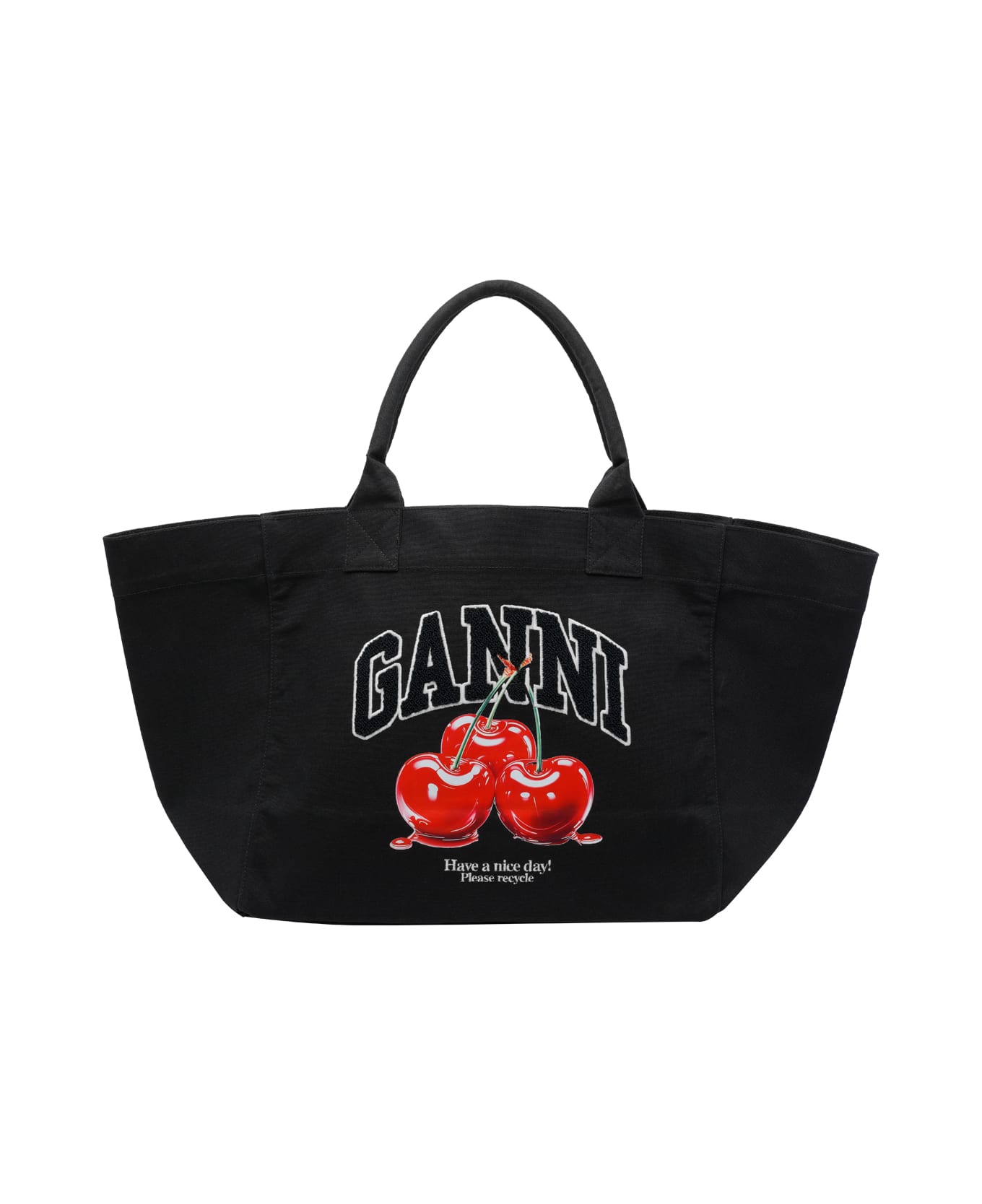 Ganni black XXL Cherry tote bag, inner zipped pocket, 2 open pockets, frontal print and logo Composition: 100% Cotton