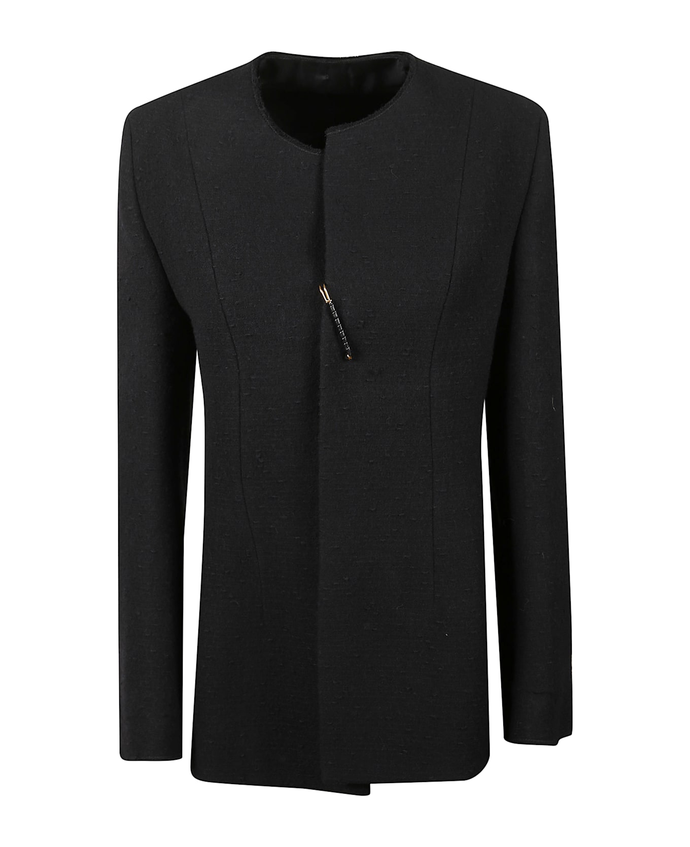 Black jacket by CARVEN featuring a deconstructed model, long sleeves and a front brooch. Composition: 97% Virgin Wool, 3% Polyamide