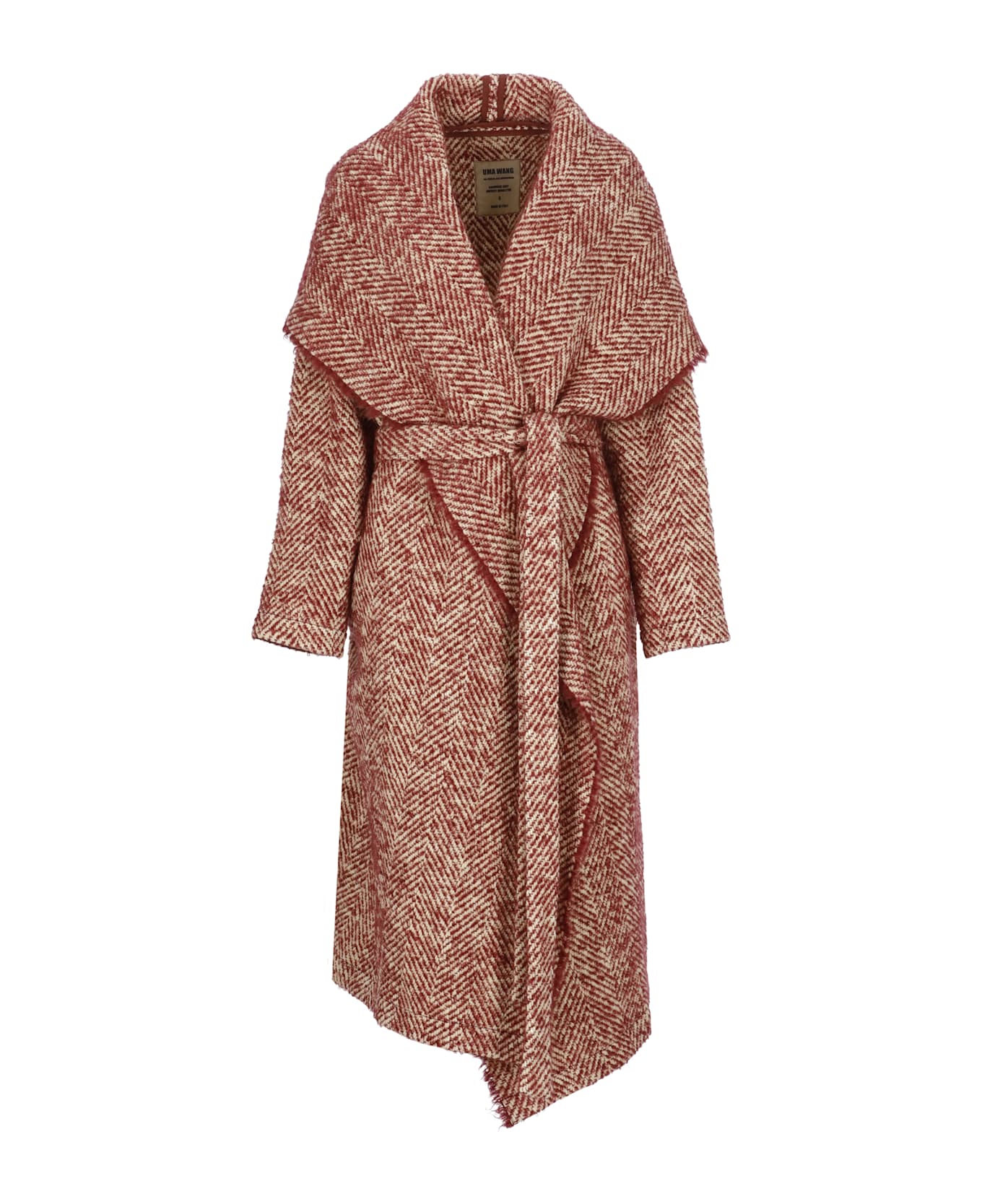 - Red Uma Wang alpaca and wool coat for woman - V neckline - Long sleeves - Matching belt included - All-over contrasting color details - Two side slit pockets