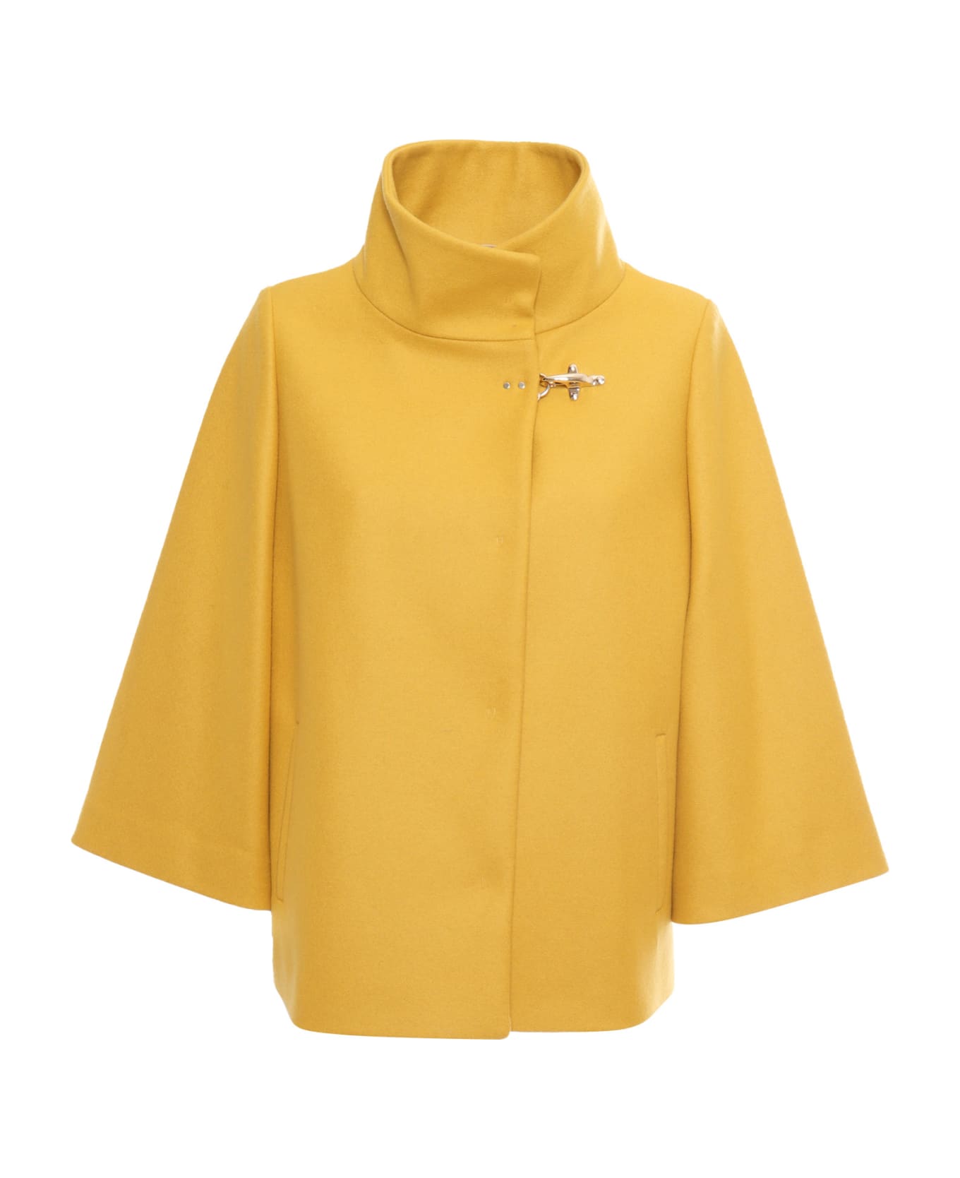 Cape in wool blend cloth, three-quarter sleeves, high collar, welt pockets, hidden fastening