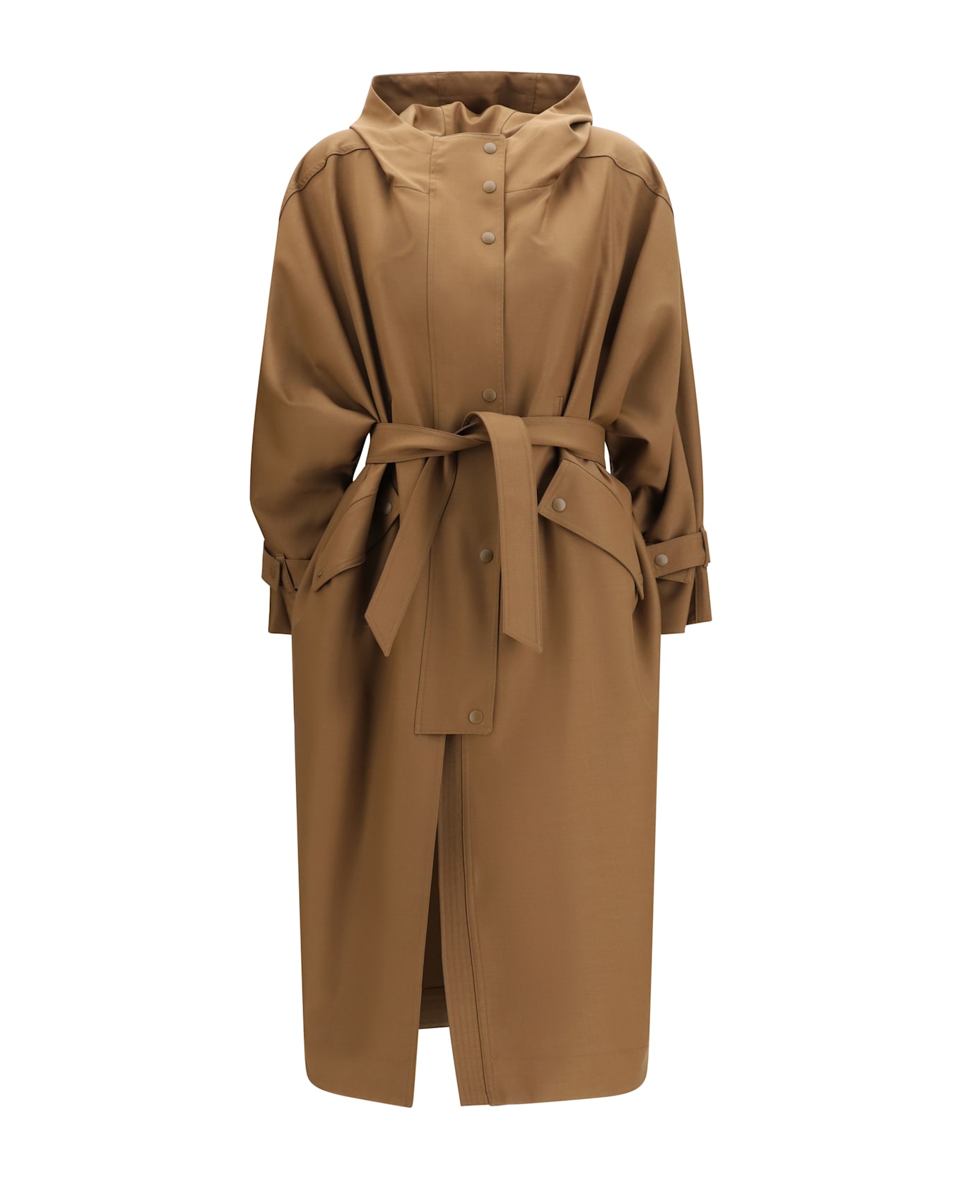 The long duster coat by max mara embodies functional elegance with a contemporary sensibility. crafted from water-repellent wool-blend gabardine, it features an enveloping, cape-inspired volume with a hood and a front-inserted waist belt to shape the silhouette. the loose fit is enhanced by deep rounded side slits, while kimono sleeves with a raglan cut at the back ensure comfort and ease of movement. a front zip and press-stud fastening, trench-style front pockets, and adjustable cuff tabs complete the design. unlined, this coat is ideal for lightweight, refined protection.