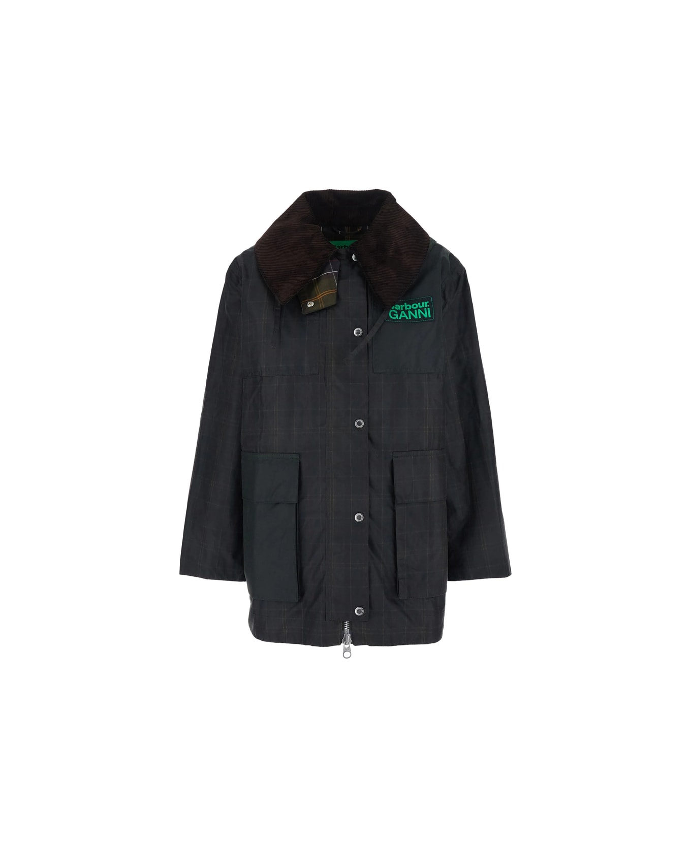 brown check pattern corduroy collar button fastening patch pockets hooded