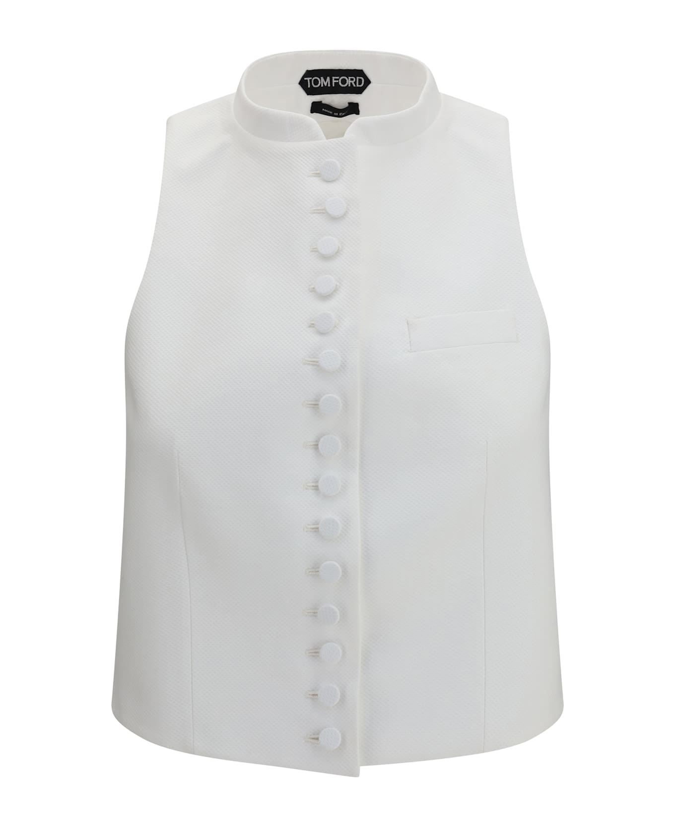 The cotton piqué waistcoat by tom ford is crafted from cotton piqué and stands out for its clean and structured silhouette. the design features a high collar, sleeveless construction, and a front button closure, creating a modern and refined look. a sophisticated and versatile piece that reflects the distinctive elegance of tom ford.