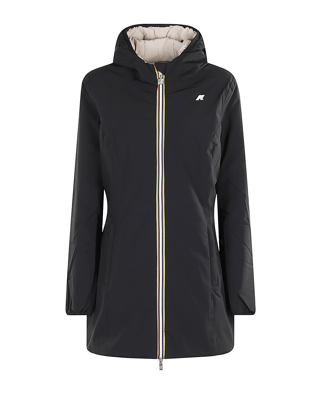 Denise Warm Double jacket - K-Way - Black color - Waterproof fabric - Reversible beige interior - Elasticized hood - Long sleeve with elasticized cuff - Flush side pockets with zipper - Silicone logo applied to chest - Front zipper closure - Regular fit.