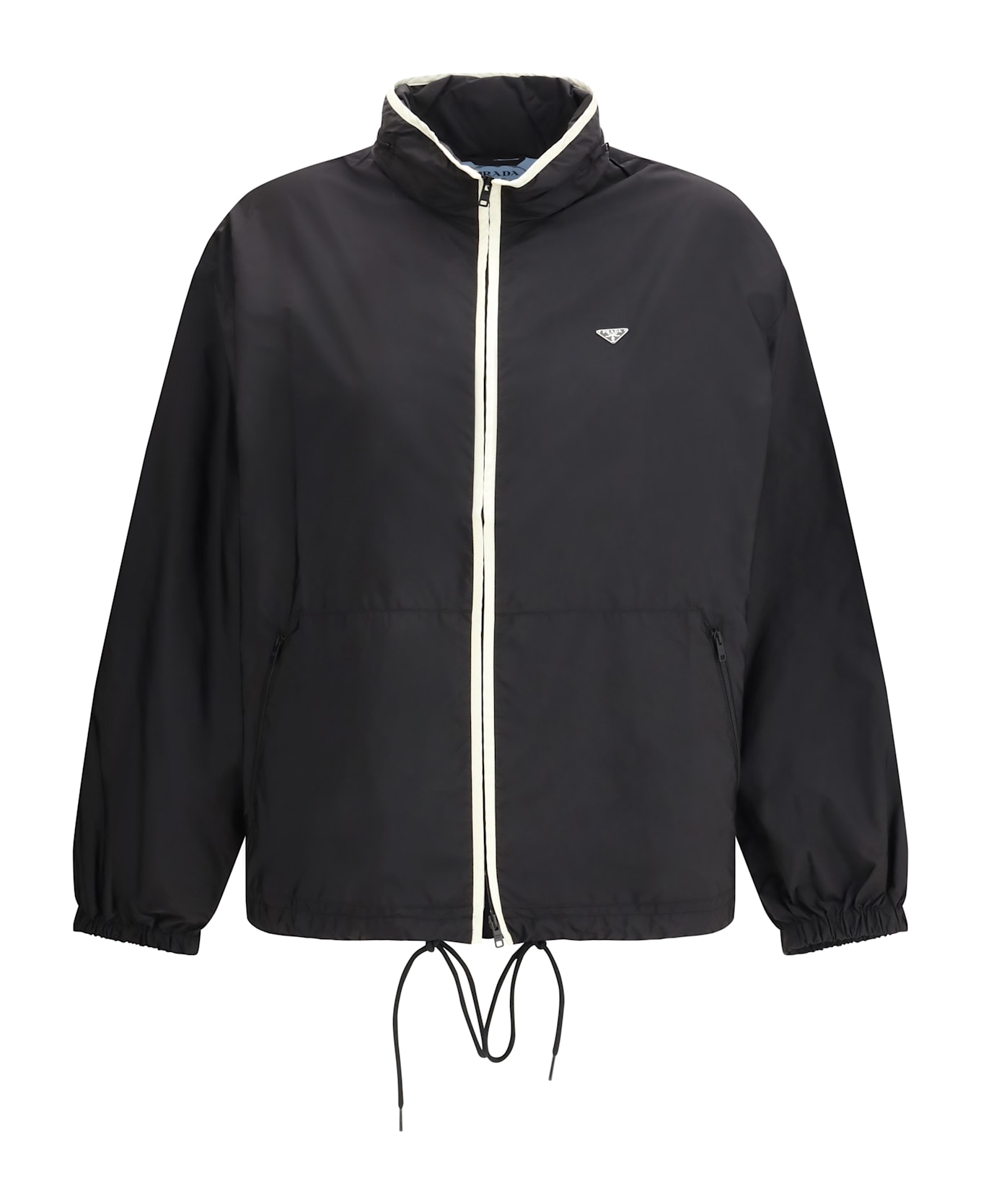 The re-nylon blouson by prada features a hybrid design that blends a classic, feminine silhouette with sporty elements inspired by technical wear. the unlined, pressed jacket includes a stand-up collar with a concealed hood that can be pulled out via a zip, long sleeves with elasticated cuffs, a front zip closure, and side pockets. a front patch pocket and drawstring hem enhance its functionality, while the enameled metal triangle logo adds a signature prada touch.