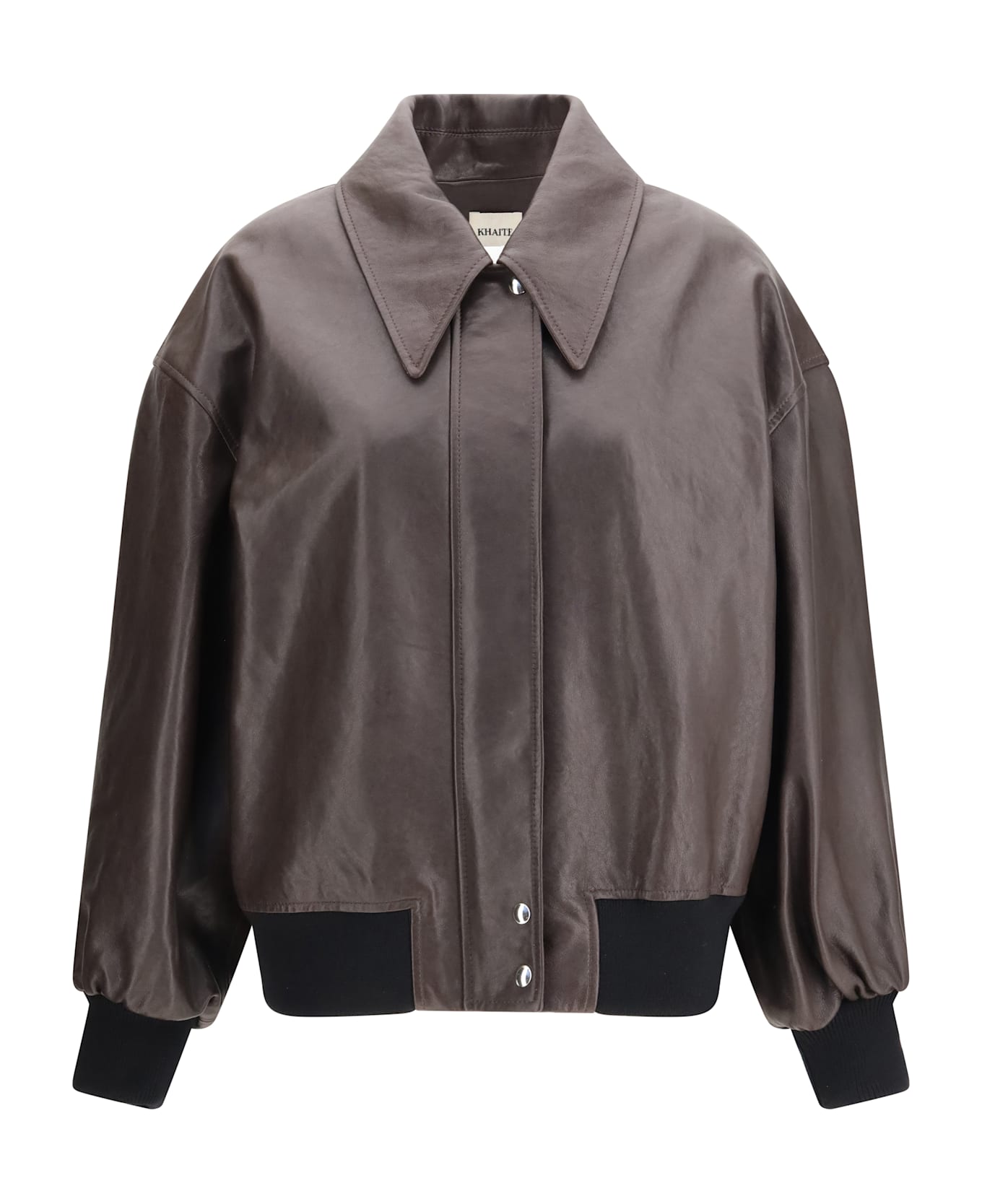 The shelman leather jacket by khaite offers an elevated interpretation of a timeless outerwear staple. crafted from soft, non-stretch leather, it features a generous cut with dropped shoulders for a relaxed yet polished silhouette. a ribbed hem provides structure, while the partially concealed front closure combines snap buttons with a two-way zipper for a refined, functional finish. standard fit: choose your usual size.