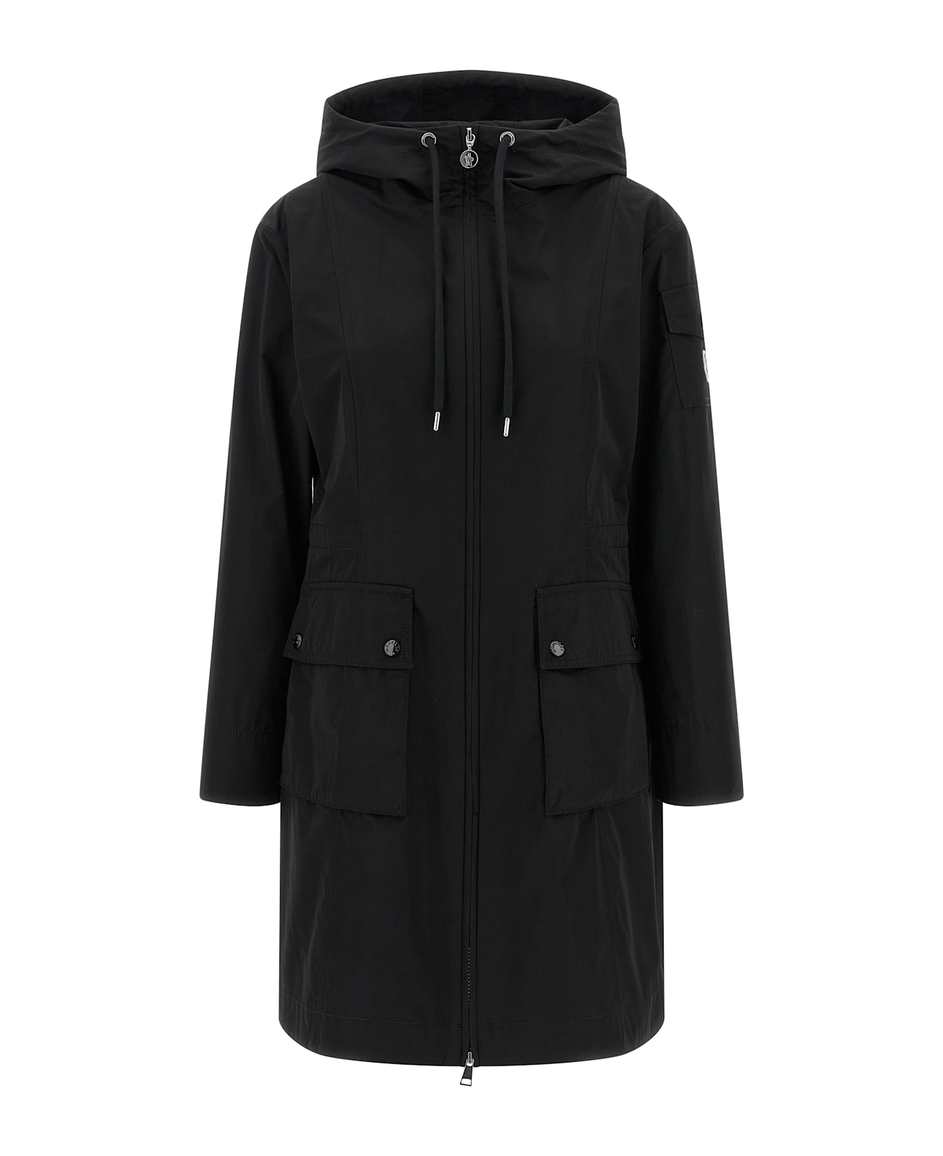 Long 'Laerte' parka in water-repellent technical fabric, unlined, hourglass silhouette, adjustable hood, high neck, front zip closure, drawstring at the waist, pockets, long sleeves with felt logo patch applied.