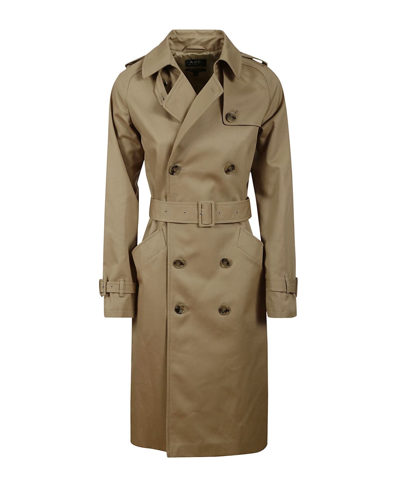 A. P. C. Beige cotton trench coat, double-breasted button closure, waist belt, adjustable cuffs, side welt pockets. Composition: 100% Cotton