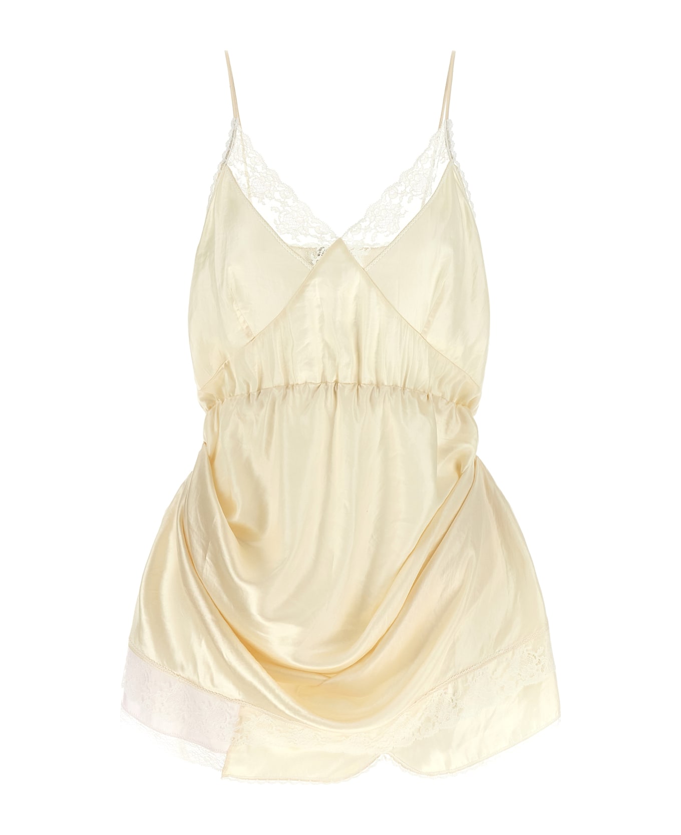 '21' shiny satin mini dress with lace inserts and piping, lingerie-inspired design, panel construction, thin straps, wide armholes, sleeveless, wide V-neck, elastic waistband, side pleats to create a fluid draping along the sides, asymmetrical hem.