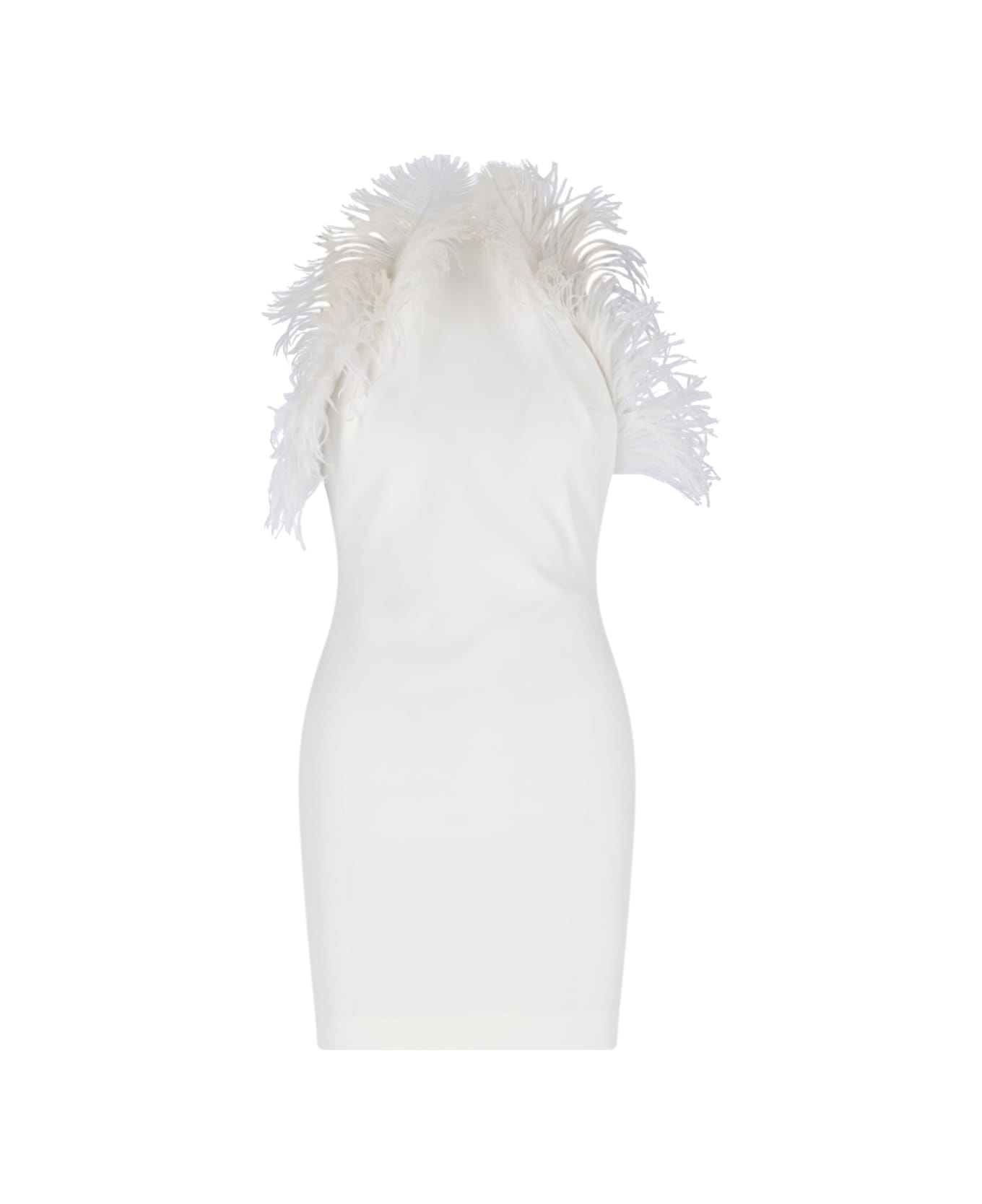 The Attico feather mini dress in white cady fabric with back zip closure, thin straps, low-cut back, tone-on-tone feather detail on the front, logo tag on the back, straight hem. Composition: 89% Polyester, 11% Elastane