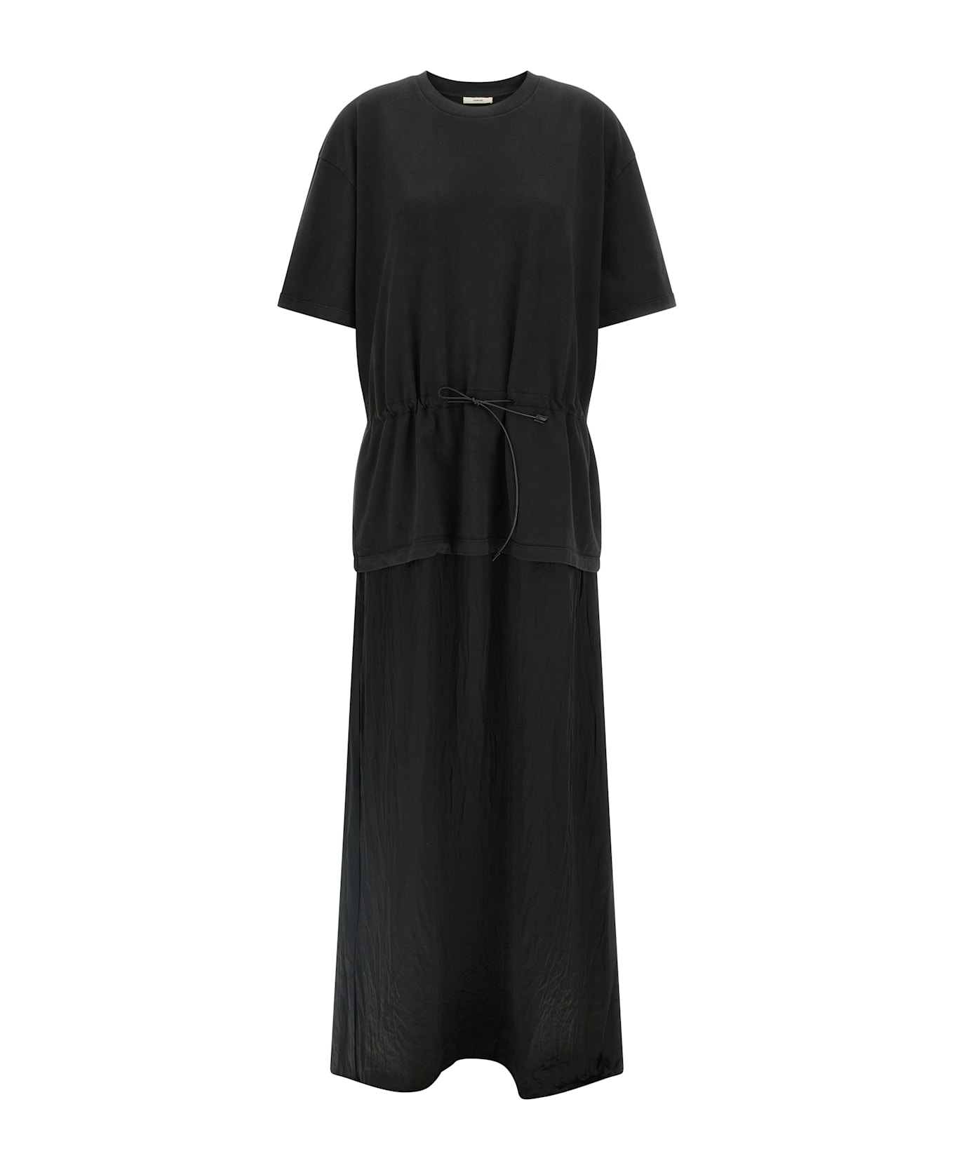 Long 'Joopy' dress consisting of cotton jersey t-shirt on top, crew neck, short sleeves with dropped shoulders, drawstring at the waist and lower part in wrinkled satin-effect fabric, wide and straight silhouette, wide side split, garment with raw cut hem.