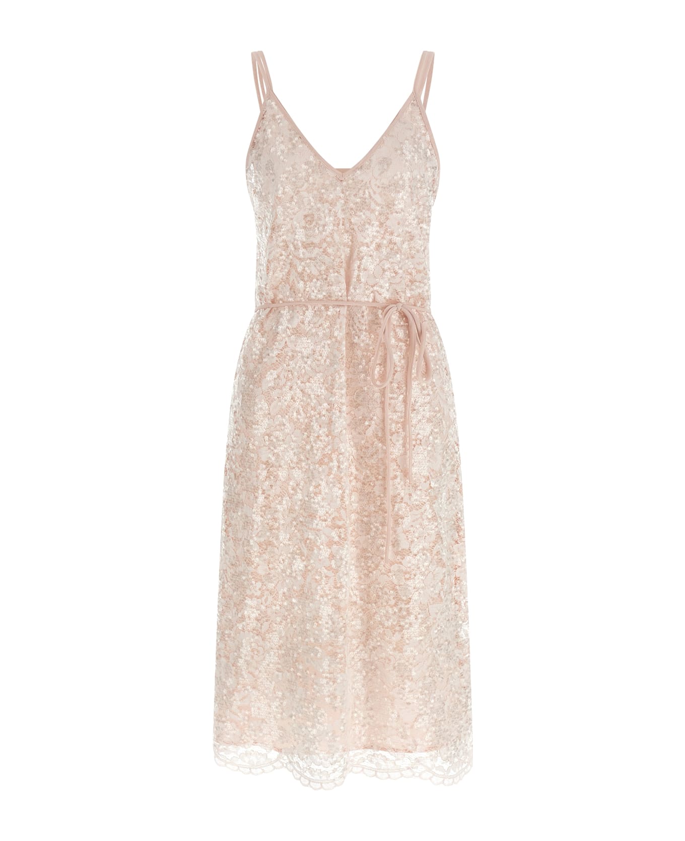 Semi-transparent lace midi dress with all-over tone-on-tone sequin appliqué, longuette model, V-neck, thin straps, sleeveless, side zip closure, removable belt, removable crepe de Chine petticoat.
