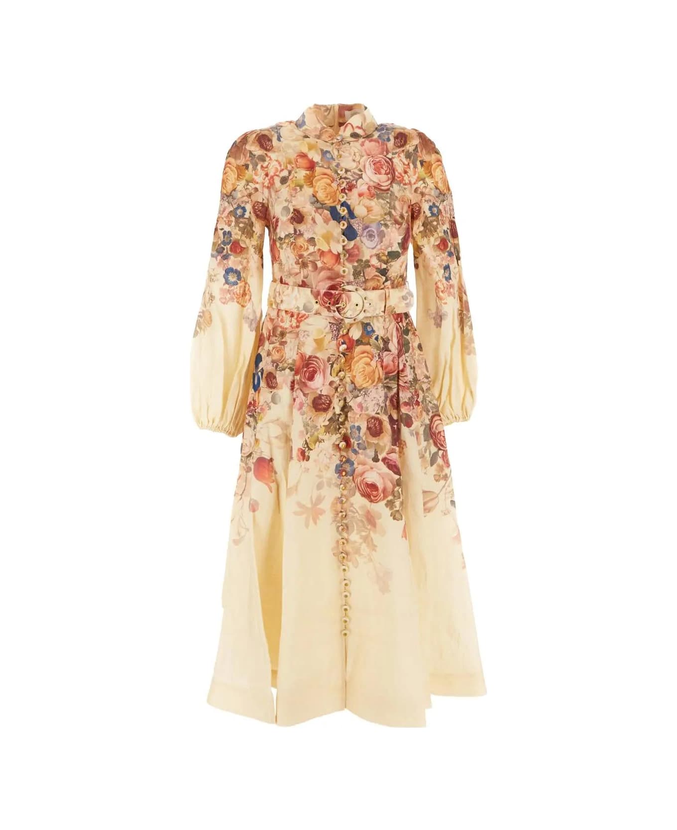 Zimmermann midi dress in morisot cream linen with floral print, blouson 3/4 length sleeves, a round neck, covered buttons with metallic gold-finish leaves,mid-waist, matching belt with rounded covered buckle, flared skirt and true to size fit.