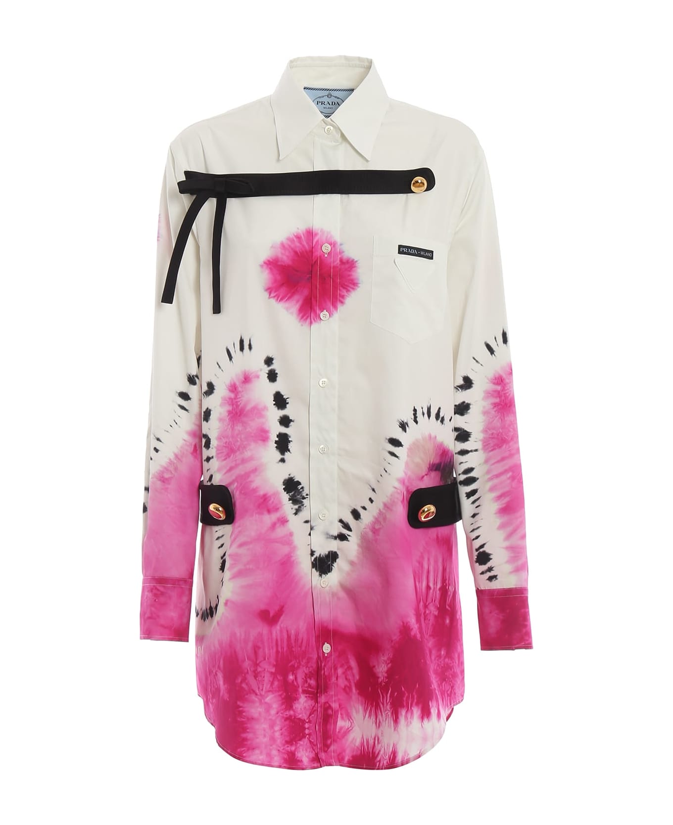 Tie-Dye Print Shirt Dress from Prada: Multicolor Tie-Dye Print Shirt Dress with pointed collar, front button fastening, satin bow on one strap, buttoned band detail at the front, chest pocket with logo patch, golden metal buttons, long sleeves, buttoned cuffs, curved hem and short length.