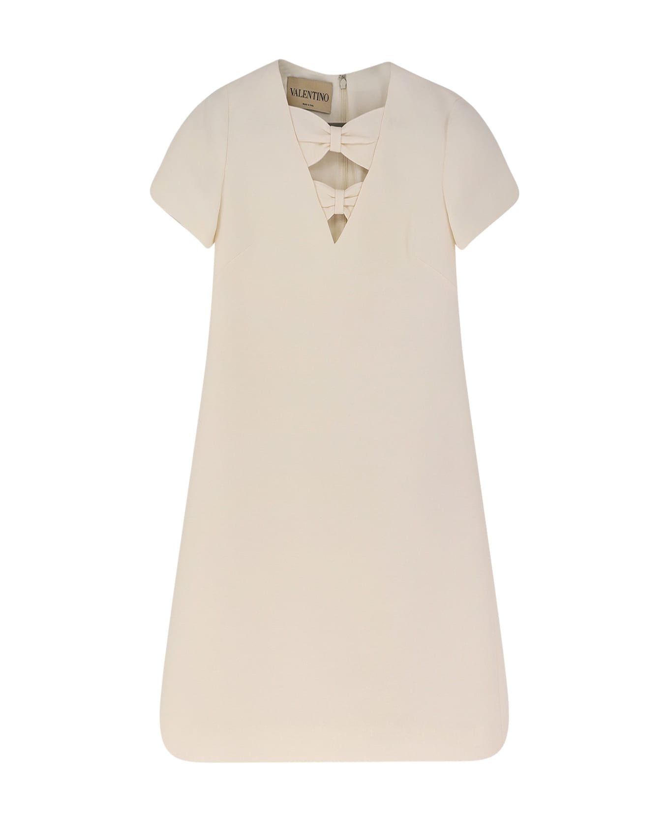 Back zip and hook closure V-neckline Double bow Short sleeves Made in Italy 65% virgin wool, 35% silk Lining: 100% silk SKU: 8B3VAHT51CFA03