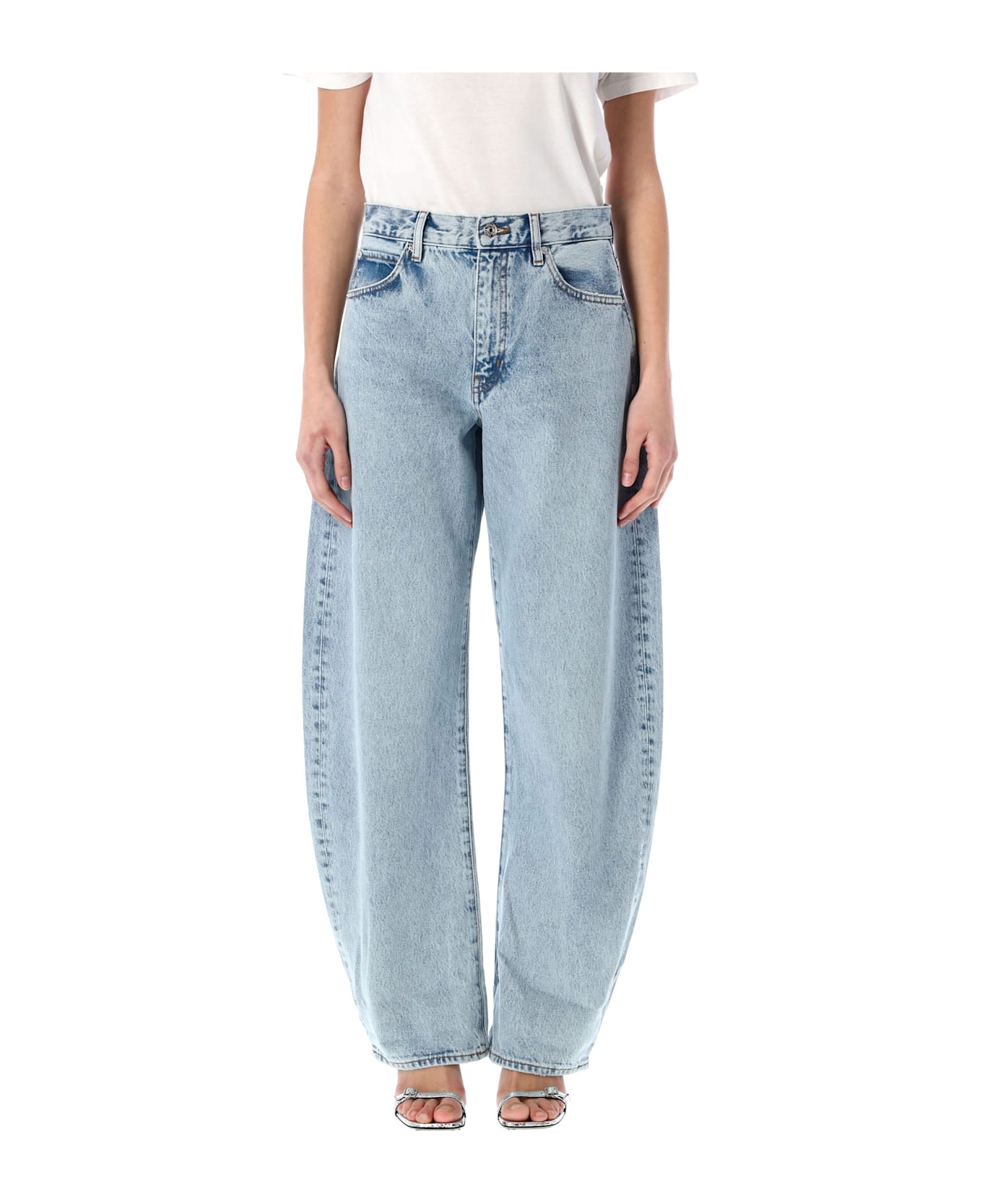 Cotton The Bubble Jean By Frame. Featuring: High Rise Button And Zip Fly Belt Loops Five Pockets Curved Outseam Barrel Silhouette Model Is 1,70 M And Wears Size 26