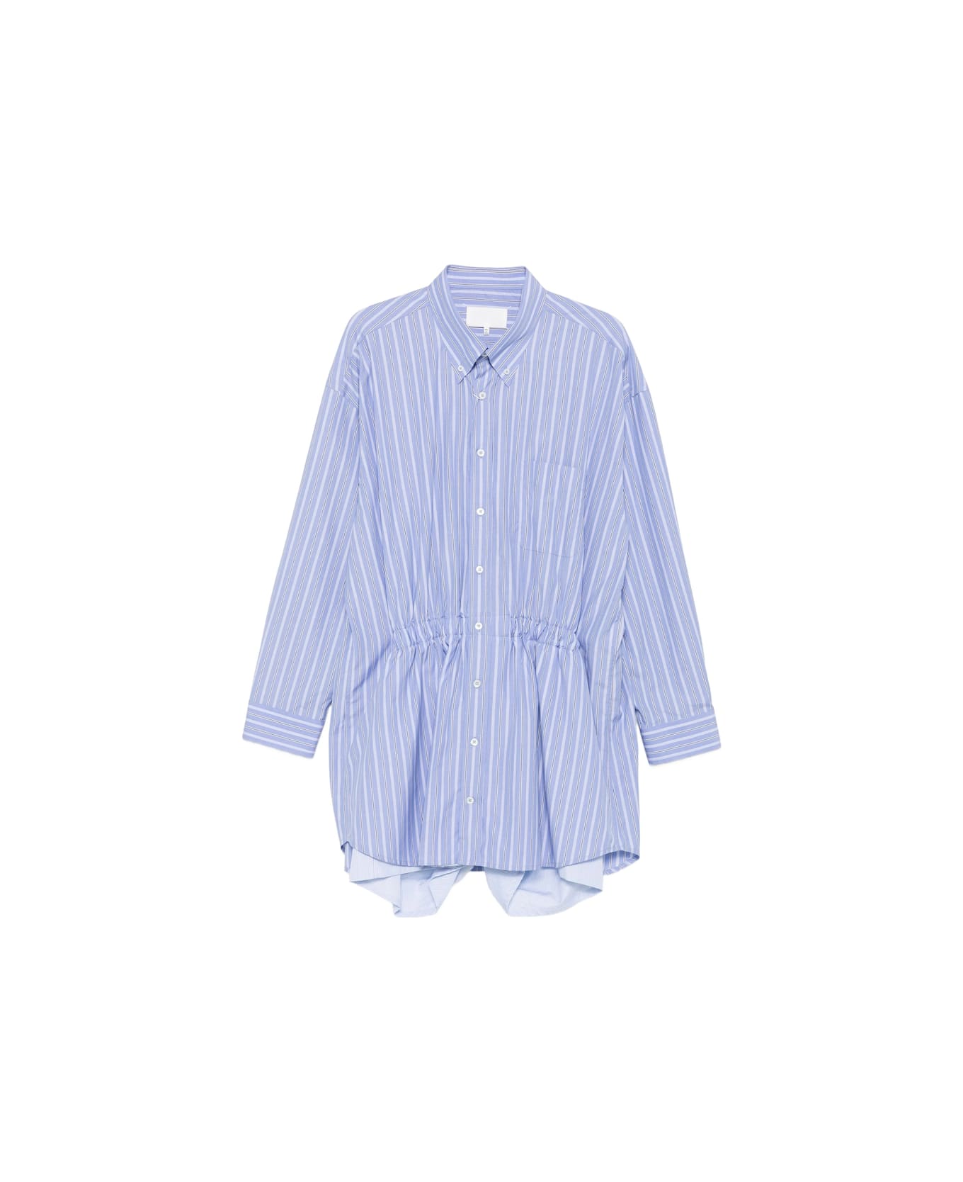 light blue striped pattern button fastening cinched waist long sleeves shirt collar