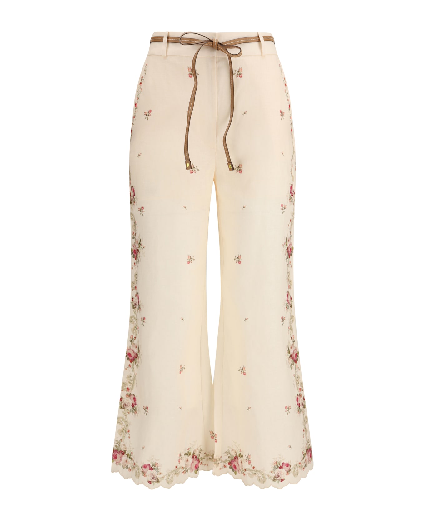 The patience flared pants by zimmermann reflect the brand s signature ethereal and romantic aesthetic. crafted from floral-printed linen, they feature a flared silhouette, scalloped hem, and intricate floral detailing. designed with slanted front pockets, back pockets, a removable leather self-tie belt, and a zip, button, and bar fastening, they offer a refined blend of elegance and craftsmanship.