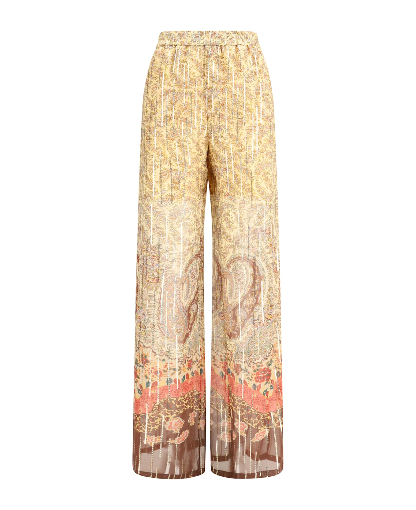 The silk georgette pants express fluid by valentino, refined elegance, highlighted by a floral paisley print with strong decorative appeal. the semi-sheer fabric, enhanced with subtle lurex details, moves lightly with the body, while the fluid leg creates an effortless, feminine silhouette. an elasticated waistband ensures comfort, complemented by two side pockets and two rear welt pockets, balancing sophistication with everyday wearability.